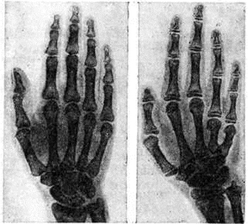 Возрастная дифференцировка скелета при допубертатной форме Гипогонадизм, как правило, запаздывает. Наблюдается неравномерный рост метаэпифизарных зон фаланг кистей, лучевой и локтевой костей, выражающийся в образовании различной формы и величины углублений и выступов, а также субхондральном склерозе. Характерно удлинение и некоторое истончение костей конечностей. У больных первичным Гипогонадизм, связанным с генетической патологией (смотри Тернера синдром), встречаются аномалии развития скелета (напр., укорочение фаланг IV—V пальцев кистей и стоп, укорочение IV и V пястных костей) — положительный метакарпальный синдром (рисунок), деформация Маделунга, врождённые клиновидные позвонки, веерообразное слияние рёбер, деформации грудины и медиальных мыщелков большеберцовых костей. ЛечениеПри первичном Гипогонадизм, начиная с пубертатного возраста, показана постоянная заместительная терапия половыми гормонами (в прошлом опотерапия). Мужчинам вводят препараты с андрогенной активностью, женщинам — эстрогены (до появления индуцированных менструаций), в дальнейшем переходят на комбинированную терапию эстрогенами и гормонами жёлтого тела. При вторичном Гипогонадизм проводят лечение гонадотропинами, при необходимости — в комбинации с половыми гормонами, по показаниям — кломифенцитрат (смотри). Препараты, их дозы и метод введения подбирают индивидуально в зависимости от формы заболевания, возраста больного и выраженности симптомов Гипогонадизм; необходимо проводить лечение также основного заболевания. Хирургическое лечениеПопытки замещения нефункционирующей (или отсутствующей) половой железы функционально активной (от донора или трупа) производили ещё в конце прошлого века. Развитию этого направления в лечении Гипогонадизм способствуют совершенствование хирургической техники, методов консервации органов, изучение совместимости тканей и изыскание активных иммунодепрессантов. Операция пересадки яичников и яичек довольно сложна, требует владения техникой шва на сосудах малого калибра. Половую железу донора берут с сохранением сосудистой ножки (дистальная ветвь от a. uterina к яичнику или a. etv. testicularis к яичку). Анастомоз сосудов пересаживаемой половой железы производят либо с ветвями бедренной артерии и вены, либо с нижней надчревной артерией и веной, при сохранении семенного канатика реципиента — с a. etv. testicularis. Яичко может быть фиксировано в мошонке, под кожей живота или с внутренней поверхности бедра; яичник фиксируют под кожей бедра. При недоразвитии полового члена делаются попытки пластически его реконструировать. Варианты операций сводятся к формированию филатовского стебля при сохранении тканей полового члена для обеспечения эротогенной чувствительности при половом сношении (смотри Coitus). Иногда с косметической целью применяют подсадку синтетических пластических материалов («яичко») в мошонку (с целью имитации наличия яичка). Прогноз для жизни благоприятный. Однако при отсутствии лечения нарастание комплекса неполноценности может привести в некоторых случаях к суицидальным попыткам. При систематическом лечении достигается развитие вторичных половых признаков, появляются индуцированные менструации, либидо, потенция, обеспечивается возможность половой жизни, исчезают сопутствующие явления (осте