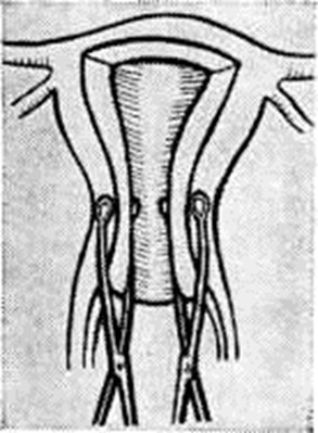 Лечение Гипотонические кровотечения должно быть направлено на быстрейшее восстановление нормальной моторной функции матки. При Гипотонические кровотечения, связанном с задержкой в полости матки частей плодного яйца, показано срочное удаление их рукой или с помощью большой тупой кюретки (смотри полный свод знаний Выскабливание, матки). Если патологическое кровотечение возникло в последовом периоде (кровопотеря 400 миллилитров и более), надо немедленно приступить к выжиманию плаценты, а при безуспешности — к ручному отделению и её удалению вместе с оболочками. Не следует применять в последовом периоде многократно методики наружного выжимания плаценты, так как они не гарантируют её удаления, а в то же время ухудшают сократительную функцию матки и увеличивают кровопотерю. Отделение и выделение плаценты в большинстве случаев приводит к восстановлению сокращений матки и остановке кровотечения, так как её удаление устраняет блокирующее влияние на моторную функцию матки плацентарного прогестерона. Рука, введённая в матку, не должна извлекаться сразу после удаления плаценты. Необходимо убедиться в восстановлении нормальных сокращений миометрия матки. При наличии гипотонии проводится массаж матки на кулаке (рисунок 1). Для этого матка смещается кулаком введённой руки кпереди, а второй рукой производят лёгкие её поглаживания через покровы передней брюшной стенки. Массаж должен проводиться бережно. Грубое механическое раздражение матки может привести к её травме и появлению обширных крупноочаговых кровоизлияний, которые резко ухудшат её и так нарушенную сократительную функцию. Одновременно с этим для стимуляции сокращения матки показано введение окситоцина или питуитрина (5—10 ЕД подкожно или непосредственно в миометрий). Хороший эффект оказывают эрготамин, эргометрин, эрготал и другие Передозировка указанных препаратов может вызвать парадоксальную реакцию миометрия матки, то есть ещё больше ухудшить её сократительную функцию. Иногда хороший эффект — усиление сократительной функции матки — наблюдается после помещения на низ живота пузыря со льдом. Рефлекторное сокращение матки при Гипотонические кровотечения можно также вызвать раздражением рецепторных полей шейки матки. Для этого в задний свод влагалища вводится на корнцанге тампон, смоченный эфиром. В комплексе с другими мероприятиями иногда хороший эффект оказывает поперечный шов на шейку матки по Лосицкой. Для этой цели используют толстый кетгут. Шов снимается через 12—20 часов. Предложены также различные методы электростимуляции матки. М. И. Медведева использовала для целей стимуляции переменный ток напряжением 5—10 вольт, а З. А. Чиладзе — разряд постоянного тока напряжением 4000 вольт. При продолжающемся кровотечении показано применение метода Бакшеева, при котором с помощью окончатых щипцов (3—4 с каждой стороны) производится клеммирование боковых отделов матки. Одна бранша зажима вводится в полость матки, а другая в боковой свод на область сосудистого пучка (рисунок 2). При сдавлении сосудов уменьшается, а иногда полностью прекращается Кровотечение. Хороший эффект достигается и при сдавлении маточных сосудов зажимами, наложенными на область параметрия через боковые своды влагалища (метод Генкеля — Тиканадзе). И. Е. Тиканадзе предложил заменить щи