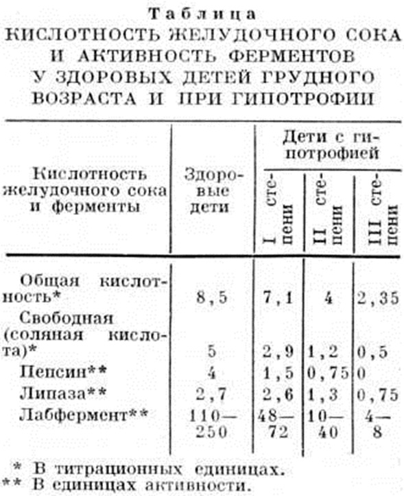 При Гипотрофия III степени имеются существенные отклонения от нормы и со стороны центральная нервная система Исследованиями Н. И. Красногорского выявлены пониженная возбудимость коры головного мозга, состояние корковой гипорефлексии и задержка развития корковых функций. В лёгких отмечается эмфизема, дыхание поверхностное, учащённое, неравномерное. Пульс пониженного наполнения, нередко учащённый и аритмичный, АД пониженное. Границы сердца в наиболее тяжёлых случаях сужены, тоны приглушены. Изменения в органах дыхания и сердечно-сосудистой системе способствуют развитию застойных явлений в лёгких и возникновению пневмонии. У ребёнка понижен аппетит, слизистая оболочка полости рта сухая, яркая, язык обложен, нередко имеется стоматит, трещины в углах рта. Печень и селезёнка нередко увеличены, плотноваты. Наблюдается снижение дезинтоксикационной и ферментообразующей функции печени. Снижены кислотность желудочного сока и активность пищеварительных ферментов (таблица). Понижены также функции поджелудочной железы (нарушены активность трипсина, липазы и амилазы) и тонкого кишечника. Это проявляется нарушением процессов переваривания и всасывания в желудке и кишечнике: их перистальтика нарушается, иногда возникают довольно упорные запоры, иногда жидкий, так называемый голодный стул, ошибочно принимаемый за проявление диспепсии, требующей ограничений в диете.