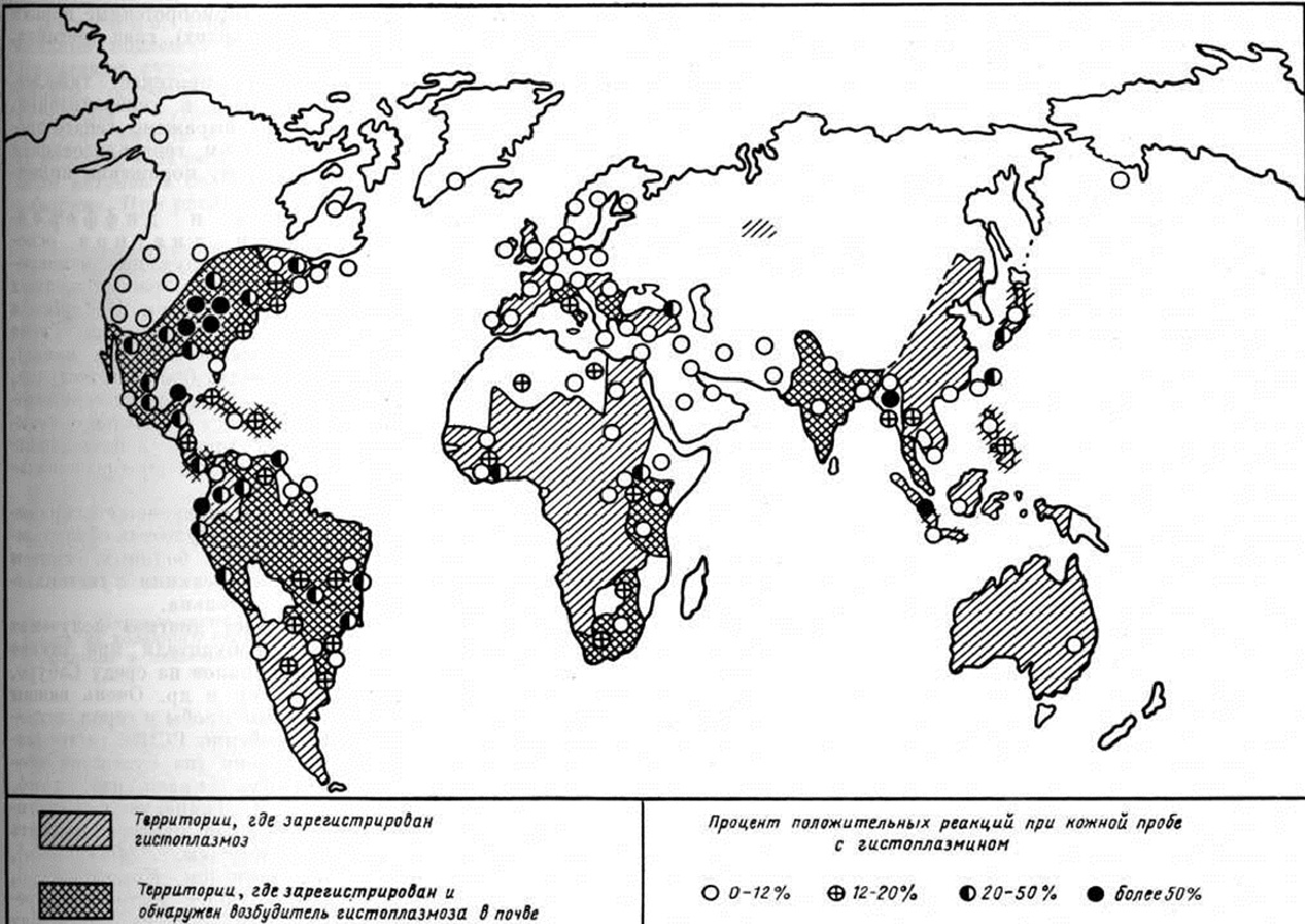В легко протекающих случаях клинической, картина проявляется катаром верхних дыхательных путей с небольшим повышением температуры тела, кашлем, головной болью в течение недели. В более тяжёлых случаях — лихорадка ремиттирующего типа, озноб, пот, кашель с гнойной мокротой, иногда с кровью, головная боль, слабость, анорексия. В лёгких — инфильтраты одиночные и множественные по типу бронхопневмонии, лобулярной, лобарной пневмонии с регионарной лимфаденопатией. Физикальные данные минимальны; клинической, и рентгенологическое картина сходны с атипической пневмонией (смотри полный свод знаний), туберкулёзом лёгких (смотри полный свод знаний Туберкулёз органов дыхания); инфильтрат при Гистоплазмоз локализуется в нижних и средней долях лёгких, позднее инфильтрат рассасывается или обызвествляется. Течение болезни — несколько недель, месяцев. Тяжёлые случаи острого первичного двустороннего Гистоплазмоз лёгких наблюдались во время вспышек инфекции в эндемических очагах. Хронический форма первичного Гистоплазмоз лёгких характеризуется длительным лечением (1—2 года и более) с периодами обострений и ремиссий. В лёгких образуются инфильтраты, тонкостенные кистообразные полости, наряду с этим в лёгких и прикорневых узлах развиваются фиброз, кальцинаты (смотри полный свод знаний Пневмосклероз). Больные испытывают резкую слабость, падает вес тела, развивается анемия, лейкопения. Эта форма в 0,1—0,2% случаев переходит в диссеминированный, системный Гистоплазмоз Клинической, картина острой стадии диссеминированного Гистоплазмоз характеризуется высокой лихорадкой с изнурительным потом, адинамией, анемией, истощением, увеличением печени, селезёнки (смотри полный свод знаний Гепато-лиенальный синдром), генерализованной лимфаденопатией. Рентгенологическое картина сходна с фиброзно-кавернозным туберкулёзом лёгких. У 20% больных диссеминированной формой Гистоплазмоз обнаруживаются язвенное поражение слизистых оболочек рта и глотки, гортани, тонкого кишечника, абсцедирующие инфильтраты в подкожной клетчатке, язвенно-вегетирующие поражения кожи лица, носа, наружных половых органов, трещины ануса. Нередко поражаются кости (в виде кистообразных полостей), суставы, часто — костный мозг, надпочечники. К тяжёлым осложнениям относится поражение центральная нервная система (менингит, энцефалит), сердца (приобретённые пороки сердца, эндокардит), глаз (ретинит, хориоидит). У детей Гистоплазмоз протекает тяжелее, с наклонностью к генерализации, чаще и резче выражены гепато-лиенальный синдром, генерализованная 1 лимфаденопатия, поражение кишечника, кожи. Диагноз и дифференциальный диагноз основывают на обнаружении в мокроте внутриклеточно расположенных дрожжевидных клеток Histoplasma capsulatum при окраске по Гимзе (смотри полный свод знаний Романовского — Гимзы метод), промывных водах бронхов, желудка, мазках гноя; при хронический диссеминированной форме — в стернальном пунктате, мазках крови (лейкоконцентрате), моче, кале, цереброспинальной жидкости. При распространённых поражениях органов возбудитель обнаруживается в крови больных, причём внутрикожная реакция с гистоплазмином отрицательна. Подтверждает диагноз получение культуры возбудителя при посеве тех же материалов на среду Сабуро, кровяной агар и другие. Очень важны внутрикожн