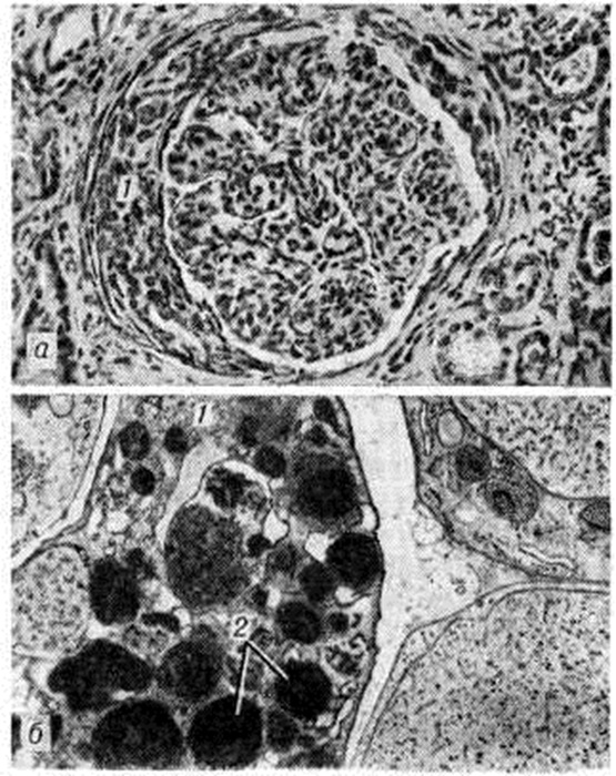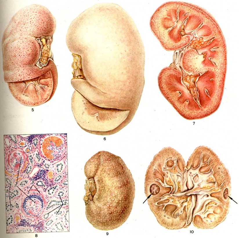 Реже ему предшествуют другие причины: пневмонии, пищевые токсикоинфекции, охлаждение, введение вакцины, сывороток, медикаментов и так далее. Реже ему предшествуют другие причины: пневмонии, пищевые токсикоинфекции, охлаждение, введение вакцины, сывороток, медикаментов и так далее. Типирование стрептококков, выделенных из зева больных Гломерулонефрит, показало, что в 78% случаев обнаруживается тип 12β-гемолитического стрептококка группы А. Преобладание 12 типа стрептококка отмечается как в спорадических случаях, так и при вспышках заболевания. В жарких странах развитию Гломерулонефрит особенно часто [в 85% случаев, по данным Диллона (Н. С. Dillon), 1967] предшествуют кожные болезни (пиодермия, импетиго, рожа); у таких больных, как правило, высеиваются пиогенные стрептококки. В сыворотке крови больных Гломерулонефрит наиболее часто обнаруживаются антитела к типу 12 стрептококка. Почти у 51% больных острым Гломерулонефрит стрептококковые антигены обнаруживаются в крови и выявляются в клубочках при иммунофлюоресцентной микроскопии [Сигал (В. С. Seegal), 1965; Андрес (G. A. Andres) с соавторами, 1966]. Часто обнаруживаются также антистрептолизин-О, антигиалуронидаза и антистрептокиназа. Однако постстрептококковый острый Гломерулонефрит с 50-х годы стал встречаться реже, что связано в значительной степени с применением мощных антибактериальных препаратов. Теснее связан со стрептококковой инфекцией Гломерулонефрит при подостром септическом эндокардите, что может проявляться не только классическим очаговым эмболическим нефритом [Лелейн (М. Н. F. Lohlein), 1910], но и диффузным поражением почек. Частота поражения почек при подостром септическом эндокардите может быть высокой — до 50%, при ревматизме (по секционным данным) — до 10,5%. Описан Гломерулонефрит и при стафилококковом эндокардите. Пневмонии осложняются Гломерулонефрит в 1—3% случаев. Роль брюшного и сыпного тифа, малярии в развитии Гломерулонефрит невелика. При малярийном нефрите находят отложение малярийного антигена в клубочках в составе иммунного комплекса наряду с иммуноглобулинами, комплементом, фибрином. При туберкулёзе клинический, картина Гломерулонефрит может оказаться ведущей. По данным В. В. Сура, А. М. Вихерта (1966), мембранозный Гломерулонефрит легко воспроизводится у животных при введении микобактериального адъюванта, то есть стимулятора процессов иммуногенеза (смотри полный свод знаний Адъюванты). Гломерулонефрит при туберкулёзе у человека описан Б. М. Коваливом и В. Ф. Подуговским (1957). Гломерулонефрит при сифилисе, протекающий обычно по нефротическому типу, редок. К инфекционно-иммунной группе Гломерулонефрит относят также малоизученные вирусные Гломерулонефрит при кори, ветряной оспе, вирусном гепатите, энтеровирусной инфекции. В группу Гломерулонефрит неинфекционно-иммунного происхождения входит Гломерулонефрит, развивающийся после ряда антигенных воздействий (сывороткой, вакциной, пыльцой растений, ядом насекомых, лекарственными и другими хим. веществами, пищевыми продуктами при индивидуальной непереносимости), а также Гломерулонефрит, возникающий при нарушении венозного оттока (частичный тромбоз почечных вен, нижней полой вены, сдавливающий перикардит, недостаточность трёхстворчатого клапана). Охлаждение, особенно при высокой влажности, может способствовать возни