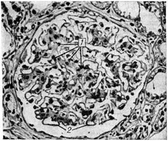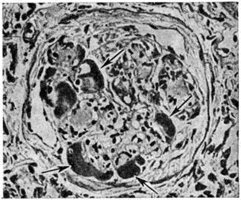 Узелковая форма характеризуется наличием в клубочках эозинофильных образований (узелков) округлой или овальной формы (рисунок 1), содержащих вакуоли. Они могут занимать часть или весь клубочек, по периферии которого в последнем случае располагаются сохранившиеся сдавленные капиллярные петли. Одновременно наблюдается расширение и аневризмы капилляров клубочков, утолщение их базальных мембран. При гистохимическом исследовании узелков они вначале окрашиваются как фибрин, а в дальнейшем как коллаген. Узелки содержат большое количество высокомолекулярных мукополисахаридов, небольшое количество кислых мукополисахаридов, жировых субстанций, в основном ненасыщенных жирных кислот и холестеринэстеров. При электронно-микроскопическом исследовании видно, что формирование узелков происходит в мезангии в виде скопления в нем глыбок и трабекул, сходных с веществом базальной мембраны.