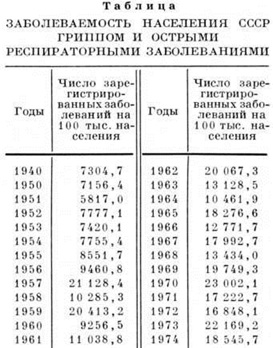 Заболеваемость Грипп и ОРЗ в СССР превышает суммарную заболеваемость всеми остальными инфекционными болезнями. В отдельные годы Грипп и ОРЗ составляли более 80% всей инфекционной патологии, более 60% заболеваний детей. Фактическая заболеваемость Грипп несколько превышает регистрируемую по обращаемости. Во время эпидемий она особенно велика в дошкольных детских учреждениях и на предприятиях. Наиболее высокие показатели заболеваемости — на крупных предприятиях, характер производства которых связан с интенсивными контактами работающих. Заболеваемость Грипп сельского населения примерно вдвое ниже, чем городского. Мужчины и женщины болеют с одинаковой частотой. У значительного числа больных отмечаются осложнения со стороны ЛOP-органов и лёгких (пневмонии). В 0,3% случаев Грипп приводит к развитию поражений нервной системы.