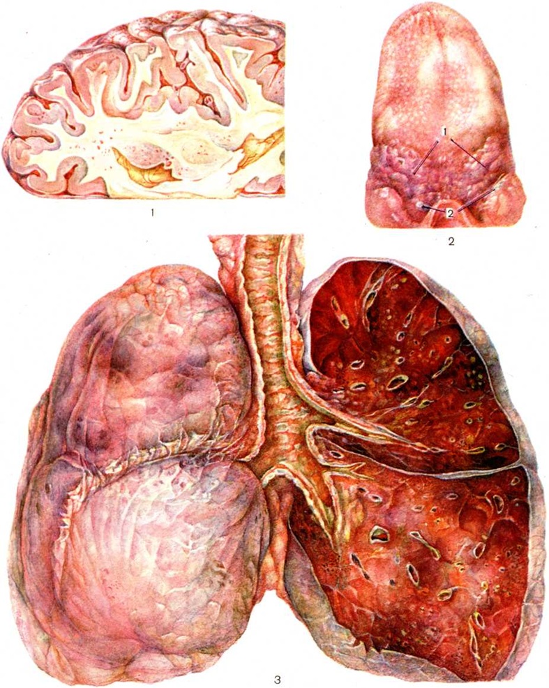 Патологическая анатомияМорфологически изменения при Грипп выражаются повреждениями органов дыхания и токсическим поражением других органов и систем. Выраженность этих изменений зависит от вирулентности возбудителя, состояния специфического и неспецифического иммунитета, а также от характера сопутствующих болезней и бактериальных осложнений. Для местных изменений при Грипп характерны слизистая и вакуольная дистрофия эпителия, частичная гибель его на протяжении дыхательных путей с последующими реактивными изменениями. Характерен серозный, катарально-гнойный, геморрагический и некротический ринит (смотри полный свод знаний), ларингит (смотри полный свод знаний) и трахеобронхит (смотри полный свод знаний Трахеит). В мазках-отпечатках со средней носовой раковины обнаруживается большое количество дистрофизированных клеток цилиндрического эпителия, в цитоплазме которых нередко обнаруживаются оксифильные включения. Наиболее резко поражаются подсвязочная область гортани, трахеи и крупные бронхи (рисунок 1), а также слизистая оболочка языка. Слизистая оболочка — огненно-красная, нередки точечные кровоизлияния и островки желтоватого цвета (очаги некрозов). В более тяжёлых случаях слизистая оболочка трахеи и крупных бронхов на всем протяжении серовато-жёлтого цвета, с небольшими участками кровоизлияний (цветной рисунок 2 и 3). Гистологически эпителий трахеи и бронхов принимает вид аркадообразных структур, возникающих за счёт отёка (смотри полный свод знаний), вакуолизации (смотри полный свод знаний) и отслойки поверхностных слоёв клеток, содержащих вирусный антиген. Часто наблюдается образование фуксинофильных цитоплазматических включений (рисунок 2) и развитие регенераторных (псевдометапластических) процессов. Клетки бронхиального эпителия под действием вируса Грипп теряют ворсинки, количество гранул в них резко уменьшается. Цитоплазматические включения представляют собой аутофагосомы, образующиеся в зоне парциального некроза цитоплазмы вследствие репродукции вируса Грипп (рисунок 3). Резкое полнокровие, отёк и круглоклеточная инфильтрация подэпителиальных слоёв сочетается с утолщением базальной мембраны и усилением секреции образующих слизь желёз. В других местах отмечается гибель эпителия, выраженное полнокровие и лейкоцитарная инфильтрация субэпителиального слоя бронхов и гнойный экссудат с колониями микробов в просвете дыхательных путей. Такого рода очаги гнойно-некротического трахеобронхита служат источником бактериальных поражений лёгочной ткани. При макроскопическом изучении в лёгких отмечается резкое полнокровие, отёк, очаги острой эмфиземы (смотри полный свод знаний Эмфизема лёгких), нередки участки уплотнения интенсивно-красного цвета с гладкой поверхностью разреза, а также гнойный бронхит (смотри полный свод знаний) и бронхиолит (смотри полный свод знаний), участки гнойной, абсцедирующей пневмонии и плевриты (цветной рисунок 3), обычно развивающиеся в случаях присоединения бактериальной, чаще стафилококковой, инфекции («пёстрые» гриппозные лёгкие). Гистологически часто обнаруживают очаги ателектаза, утолщение межальвеолярных перегородок за счёт белкового пропитывания и полнокровия, дистрофию и десквамацию альвеолоцитов. В просвете альвеол, кроме разрушающихся альвеолоцито