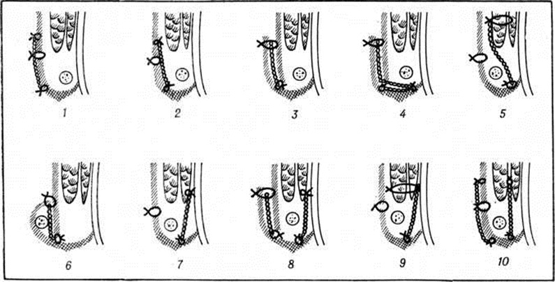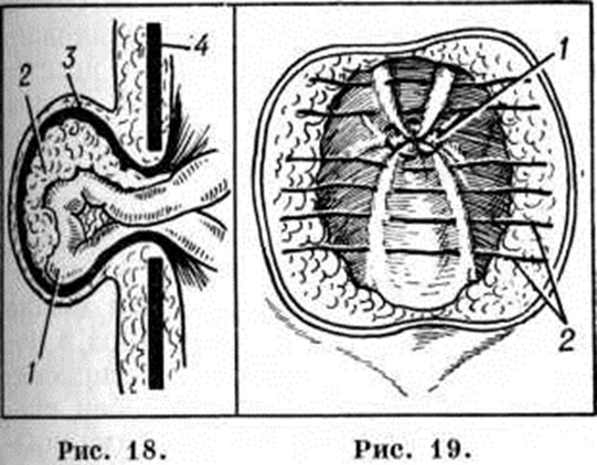 Лечение ущемлённой Грыжи всегда оперативное, и, так как опасность омертвения ущемлённых органов с каждым часом возрастает, операция должна быть неотложной. По данным Н. С. Утешева (1972), в первые 6 часов от момента ущемления в стационар поступает 58,3% больных, в сроки от 6 до 24 часов — 26,7%, остальные больные поступают позже 24 часов. Попытки вправления ущемлённой Грыжи недопустимы. Однако вправление ущемлённой Грыжи при кахексии, свежем инфаркте миокарда, дыхательной или сердечной декомпенсации возможно, но не позднее 2 часов от момента ущемления. Бескровное вправление допускается в течение 1—2 часов после ущемления путём опорожнения мочевого пузыря и кишечника, приподнимания таза, назначения тёплой грелки, введения морфина. Ручной способ может привести к мнимому вправлению Грыжи в предбрюшинную клетчатку вместе с ущемляющим кольцом (рисунок 4). Операция при ущемлённой Грыжи может быть сложной в связи с необходимостью резекции кишки при её некрозе. В этих случаях оперировать лучше под наркозом. При местной анестезии пользуются методом ползучего инфильтрата по А. В. Вишневскому (смотри полный свод знаний Анестезия местная) с обильным пропитыванием раствором новокаина и рассечением тканей строго последовательно. При операции ущемлённой Грыжи стенку мешка рассекают осторожно, чтобы не повредить внутренностей, особенно при отсутствии в нем грыжевой воды. Ущемлённые органы захватывают салфеткой, только после этого рассекают снаружи внутрь ущемляющее кольцо. При этом надо помнить о возможности ранения сосудов и сращённых с шейкой грыжевого мешка внутренностей. По рассечении кольца ущемлённые внутренности выводят наружу для осмотра странгуляционной борозды и части органов, находившейся в брюшной полости. При сдавлении только венозных сосудов кишка синюшна, но после рассечения ущемляющего кольца принимает обычную окраску. При сдавлении же артерий или тромбировании их наступает омертвение кишечной петли, и тогда она выглядит чёрной, тусклой, лишённой тонуса и перистальтики, сосуды брыжейки не пульсируют. Иногда в месте некроза видно прободное отверстие. Очень трудно распознаются переходные стадии. В этих случаях в целях определения жизнеспособности кишечной петли применяют термометрию, просвечивание (трансиллюминацию). Если, несмотря на согревание ущемлённой кишки путём обкладывания салфетками, смоченными тёплым (t°40—45°) физиологический раствором, кишка не розовеет и её перистальтика и пульсация сосудов брыжейки не восстанавливаются, кишку считают нежизнеспособной и резецируют, для чего лучше перейти к лапаротомии под наркозом. При восстановлении нормального цвета, перистальтики и пульсации сосудов брыжейки кишку вправляют в брюшную полость. Резекцию ущемлённой кишки производят с удалением не менее 30— 40 сантиметров неизменённого приводящего и 15—20 сантиметров отводящего отрезка от границы ущемления. Сшивание резецированной кишки производят обычно конец в конец, а при узком просвете отводящего её отрезка некоторые хирурги предпочитают наложение соустья бок в бок. Ущемлённый сальник резецируют. Ущемление других органов (помимо кишки и сальника) встречается редко. Описаны ущемления червеобразного отростка, внутренних женских половых органов, стенки мочевого пузыря, appendices epiploicae. Находящийся в грыжевом мешке 