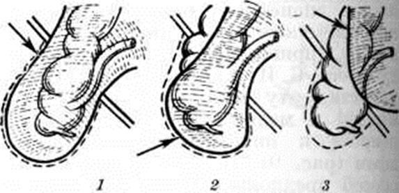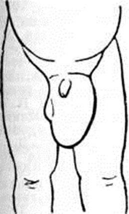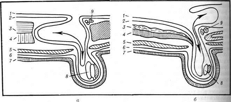 Для сальника типичны дольчатость, плотность, тупой звук при перкуссии. Приращение его к грыжевому мешку создаёт болевые ощущения при выпрямленном положении больного (симптом натянутой струны). При Грыжи мочевого пузыря часто страдает мочеиспускание, оно может происходить в два приёма, задерживаться, иногда больной при мочеиспускании принимает вынужденное положение тела. Размер Грыжи изменяется по мере накопления мочи в пузыре, Распознавание паховой Грыжи обычно не представляет затруднений. Припухлость выше паховой связки, увеличивающаяся при натуживании и кашле, указывает на паховую Грыжи Особенно легко распознается паховомошоночная Грыжи. Начальные стадии паховой Грыжи диагностируются труднее, в этих случаях помогает симптом кашлевого толчка. В неясных случаях рекомендуются повторные и вечерние осмотры. Косая грыжа повторяет тот путь, который проделало яичко вместе с влагалищным отростком брюшины. Если он не облитерируется, то содержимое Грыжи лежит вместе с яичком, и такая Грыжи называется врождённой яичковой Грыжи; по А. П. Крымову (1911), она наблюдается в 3% случаев. А. П. Крымов, Н. В. Воскресенский и другие считают, что в косой паховой Грыжи грыжевой мешок всегда является влагалищным отростком брюшины, однако большинство хирургов различает и приобретённую паховую Грыжи, при которой грыжевой мешок совершенно отделен от влагалищного отростка брюшины и яичка. В косой Грыжи мешок располагается всегда в толще семенного канатика (смотри полный свод знаний), находясь под fascia spermatica. По отношению к элементам семенного канатика грыжевой мешок лежит кнаружи и кпереди от сосудов и семявыносящего протока (смотри полный свод знаний), но нередко элементы семенного канатика облегают грыжевой мешок со всех сторон. В развитии косой паховой Грыжи различают несколько стадий. Вначале выпячивание ощущается лишь введённым в паховый канал пальцем при натуживании или при покашливании больного (симптом кашлевого толчка). Это начальная форма Грыжи. Если дно грыжевого мешка не выходит за пределы поверхностного пахового кольца, говорят о канальной, или неполной, Грыжи Когда же грыжевое выпячивание, располагаясь по ходу канатика, выходит за пределы поверхностного пахового кольца, говорят о полной, или канатиковой, Грыжи Наконец, если грыжевое выпячивание спускается в мошонку и растягивает её иногда до огромных размеров (рисунок 6), говорят о пахово-мошоночной Грыжи Косое направление пахового канала характерно для первых стадий развития косой паховой Грыжи; при Грыжи больших размеров паховый канал постепенно принимает прямую форму и поверхностное паховое кольцо находится почти на одном уровне с глубоким. У таких больных через грыжевые ворота можно ввести несколько пальцев. Б. Э. Линберг (1926) называет такую Грыжи косой с выпрямленным каналом, а Ойдтманн (Oidtmann) — наружной прямой паховой Грыжи. Чтобы найти грыжевой мешок при косой паховой Грыжи, хирург должен рассечь следующие ткани: 1) кожу с подкожной клетчаткой; 2) поверхностную фасцию; 3) апоневроз наружной косой мышцы, а ниже поверхностного пахового кольца — fascia cremasterica; 4) m. cremaster и внутреннюю семенную фасцию, под которой и находится грыжевой мешок. Эта оболочка и грыжевой мешок связаны тонким слоем клетчатки, являющейся продолжением подбрюшинной клетчатки живота, который иногда почти