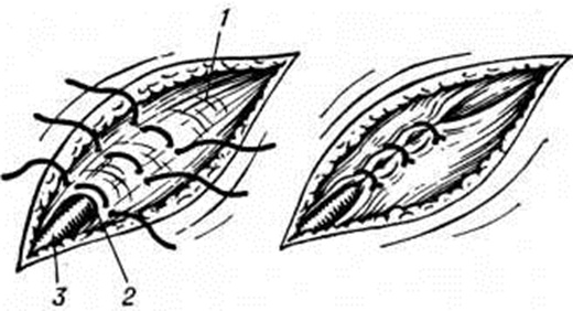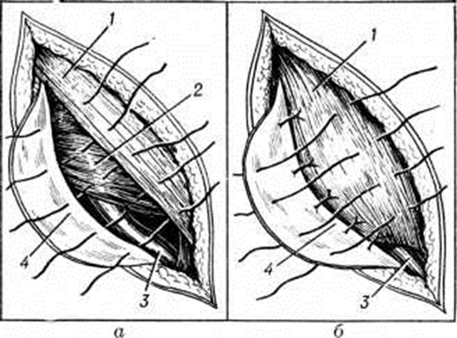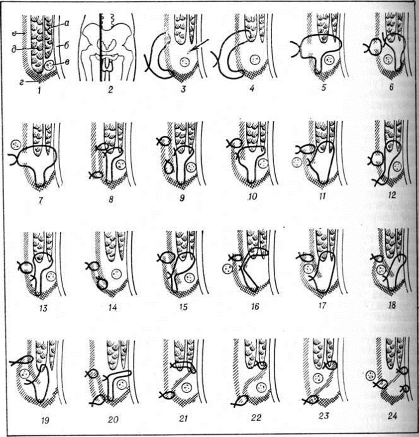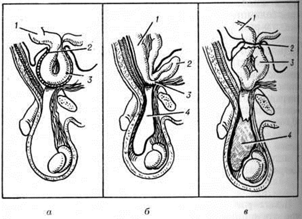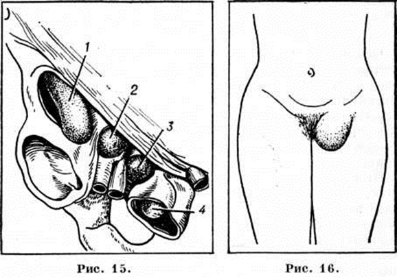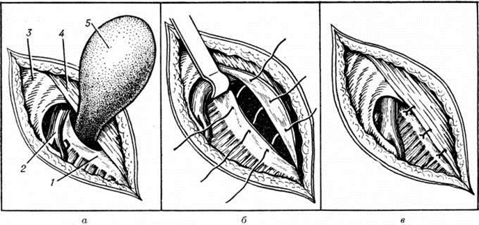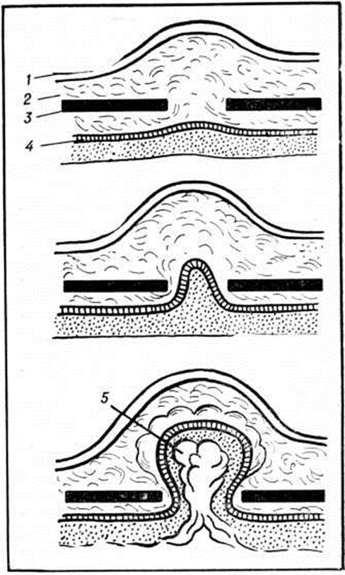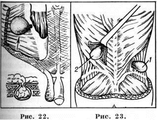 У женщин паховая Грыжи встречается реже, но ущемление её наблюдается относительно чаще. Нахождение маточной трубы, яичника в грыжевом мешке вызывает боли, усиливающиеся при менструации. Описаны случаи нахождения в грыжевом мешке беременной матки. Правильное распознавание находящихся в грыжевом мешке внутренних половых органов возможно только при влагалищном исследовании. Особенностью операции грыжесечения у женщин является то, что у них наглухо зашивают паховый канал. Рецидивы паховых грыж после хирургического лечения бывают часто. Частота рецидивов при косых паховых грыжах колеблется в пределах 3—15% , при прямых паховых грыжах частота рецидивов, по данным ряда авторов, составляет 15— 35%. Основными моментами, играющими роль в возникновении рецидива, являются нагноение раны, обширная гематома, неполное удаление грыжевого мешка, повреждение подвздошно-пахового и подвздошно-подчревного нервов, преждевременная физических нагрузка после операции и другие Причиной более частого рецидивирования прямых паховых Грыжи являются недостаточно надёжное пластическое укрепление области грыжевых ворот, в частности плохое укрепление высокого пахового промежутка, оставление незашитой поперечной фасции и некоторые другие моменты. При операции рецидивной Грыжи все рубцы должны быть иссечены для восстановления анатомических соотношений элементов пахового канала. Способ пластики его выбирают в зависимости от сохранности тканей и вида Грыжи, особенно рекомендуется способ Н. И. Кукуджанова. При больших рецидивных Грыжи и невозможности надёжной пластики местными тканями применяют аллопластику (рисунок 14) с укреплением слабого места брюшной стенки лоскутом из синтетического материала (Б. В. Петровский, 1958). При многократно рецидивирующей Грыжи для создания новой паховой связки рекомендуют использовать гетерогенную брюшину. Большинство хирургов удлиняет срок пребывания в постели после операции при рецидивных Грыжи до 2 недель. Бедренная грыжа (hernia cruralis, s. femoralis) занимает по частоте второе место после паховых. Чаще встречается у женщин в возрасте 40—60 лет. Предрасположением к образованию бедренной Грыжи является увеличение размеров и анатомическая слабость глубокого бедренного кольца, так как при увеличении промежутка между бедренной веной и лакунарной связкой уменьшается прочность этой области. Вследствие большей ширины таза эти особенности больше выражены у женщины. Наличие дивертикула брюшины в бедренном канале (смотри полный свод знаний), в который опускаются внутренности, создаёт условия для быстрого развития бедренной Грыжи А. П. Крымов различает три разновидности бедренной Грыжи: 1) выходящая через сосудистую лакуну — сосудисто-лакунарная Грыжи (рисунок 15,3); 2) проходящая через лакунарную связку — грыжа Ложье; 3) Грыжи, проходящая через мышечную лакуну (рисунок 15,1) — грыжа Гессельбаха (мышечно-лакунарная бедренная Грыжи, спускающаяся во влагалище т. iliopsoas). В свою очередь сосудисто-лакунарная бедренная Грыжи имеет четыре разновидности. 1. Полная сосудистолакунарная Грыжи, занимающая всю сосудистую лакуну. 2. Грыжи части сосудистой лакуны со следующими вариантами: а) медиальная сосудистолакунарная бедренная Грыжи — наиболее частая разновидность бедренной Грыжи; б) межвлагалищная сосудисто-лакунарная бедренная Гр