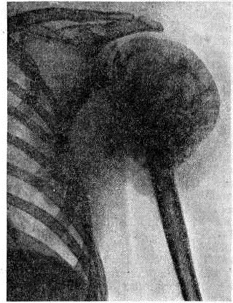 Диагноз устанавливают на основании клинические, картины, данных рентгенологическое исследования и результатов биопсии. Рентгенологические картина довольно характерна. В губчатом веществе кости определяется участок деструкции костной ткани с ровными контурами. Очаг располагается несколько эксцентрически в области эпифиза, со стороны эпифизарного хряща, и распространяется на компактное вещество кости. Иногда очаг хондробластомы может быть немного смещён в направлении метафиза. Корковое вещество на уровне опухоли истончено п подрыто, но, как правило, слой его сохраняет непрерывность (рисунок 1). На фоне деструкции выявляются в виде крапа включения солей кальция. Иногда дефект костной ткани пронизывают отдельные костные перегородки, придающие ему вид многокамерной кисты. На уровне участка поражения кость, как правило, утолщена, как бы вздута. Периостальные наслоения выражены слабо. При значительных размерах опухоли в поражённой кости определяется конгломерат хрящевой ткани с зонами обызвествления, который чётко отграничен от окружающих опухоль мягких тканей (рисунок 2).