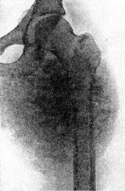 В распознавании хондросаркомы важная роль принадлежит рентгенологическое исследованию — данным рентгенографии (смотри полный свод знаний), томографии (смотри полный свод знаний) и ангиографии (смотри полный свод знаний). Важным рентгенологическое признаком хондросаркомы является нарастание имеющихся или возникновение новых патологический изменений при повторных рентгенологическое исследованиях. Преимущественно внутрикостная хондросаркома характеризуется деструкцией костной ткани, зона которой занимает большую часть или весь костномозговой канал поражённой кости (рисунок 1). Опухоль имеет нечёткие границы, что особенно заметно в области костномозгового канала. Структура участка поражения, как правило, неоднородная за счёт многочисленных включений солей кальция в виде крапа, островков или конгломератов.