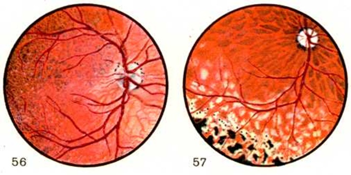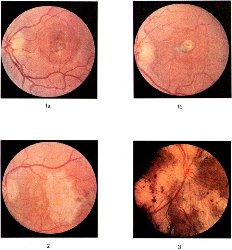 При прогрессировании процесса отмечается слияние гранулем и формирование крупного конглобированного очага — туберкула. Клиническая картина. У больных с хориоидитом отсутствуют болевые ощущения и зрительные расстройства, поэтому нередко его выявляют только при офтальмоскопии (смотри полный свод знаний). При вовлечении в процесс прилежащих к хориоидальному очагу отделов сетчатки (хориоретинит) возникают нарушения зрения. Когда хориоретинальный очаг расположен в области центральных отделов глазного дна, отмечается резкое снижение зрения, искажение рассматриваемых предметов (смотри полный свод знаний: Метаморфопсия), больной ощущает вспышки и мерцания (смотри полный свод знаний: Фотопсии). При поражении периферических отделов глазного дна снижается сумеречное зрение (смотри полный свод знаний: Гемералопии), иногда наблюдаются летающие мушки. Выявляются ограниченные дефекты в поле зрения — скотомы (смотри полный свод знаний), соответствующие месту расположения очагов. Воспалительные очаги в хориоидее, выявляемые при офтальмоскопии, могут быть единичными или множественными, имеют различную величину и форму, но чаще бывают округлыми. Размер очагов от ½ до 1½ диаметра диска зрительного нерва, редко наблюдаются более мелкие или очень крупные очаги. При активном воспалении на глазном дне видны сероватые или желтоватые очаги с нечёткими контурами (цветной рисунок 1 а, б), проминирующие (вдающиеся) в стекловидное тело (смотри полный свод знаний); сосуды сетчатки располагаются над ними, не прерываясь. В этот период в связи с поражением сосудов возможны кровоизлияния в хориоидею, сетчатку и стекловидное тело. Прогрессирование заболевания и распространение процесса на окружающие ткани приводят к развитию помутнения сетчатки в области очага; при этом небольшие сосуды сетчатки невидимы. В отдельных случаях развиваются помутнения в заднем отделе стекловидного тела. Под влиянием лечебный воздействий хориоретинальный очаг уплощается, становится прозрачным, приобретает более чёткие контуры. На границе очага появляется пигментация в виде мелких точек. Чаще на месте очага исчезают мелкие и средние сосуды хориоидеи; хориоидея истончается, через неё просвечивает склера. При офтальмоскопии на красном фоне глазного дна виден белый очаг с крупными сосудами хориоидеи и пигментными глыбками. Резкие границы и пигментация очага свидетельствуют о переходе активного воспаления в стадию атрофии хориоидеи (цветной рисунок 2). При расположении хориоретинального очага около диска зрительного нерва возможно распространение воспаления на зрительный нерв. В таких случаях в поле зрения появляется характерная скотома, сливающаяся с физиологической; при офтальмоскопическом исследовании определяется стушеванность границ зрительного нерва. Развивается перипапиллярный хориоретинит, называемый также околососочковым нейроретинитом Йенсена, юкстапапиллярным ретинохориоидитом Йенсена, циркумпапиллярным ретинитом (смотри полный свод знаний). Описанные клинические, проявления хориоидита не являются характерными для заболевания какой-либо определённой этиологии и могут быть выявлены при вирусных, стрептококковых и других хориоидитах. При туберкулёзном поражении хориоидеи (цветной рисунок 3) чаще встречаются такие клинические, формы,