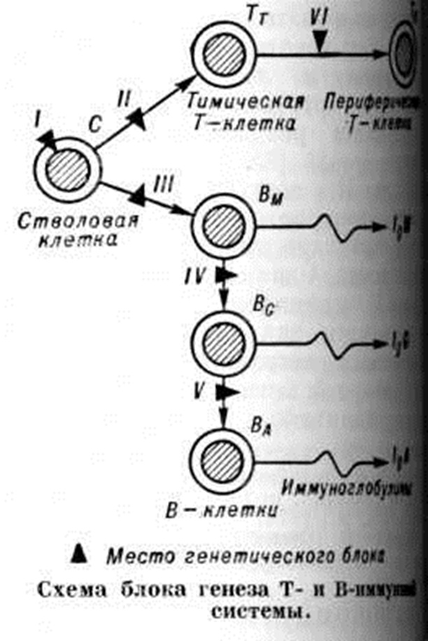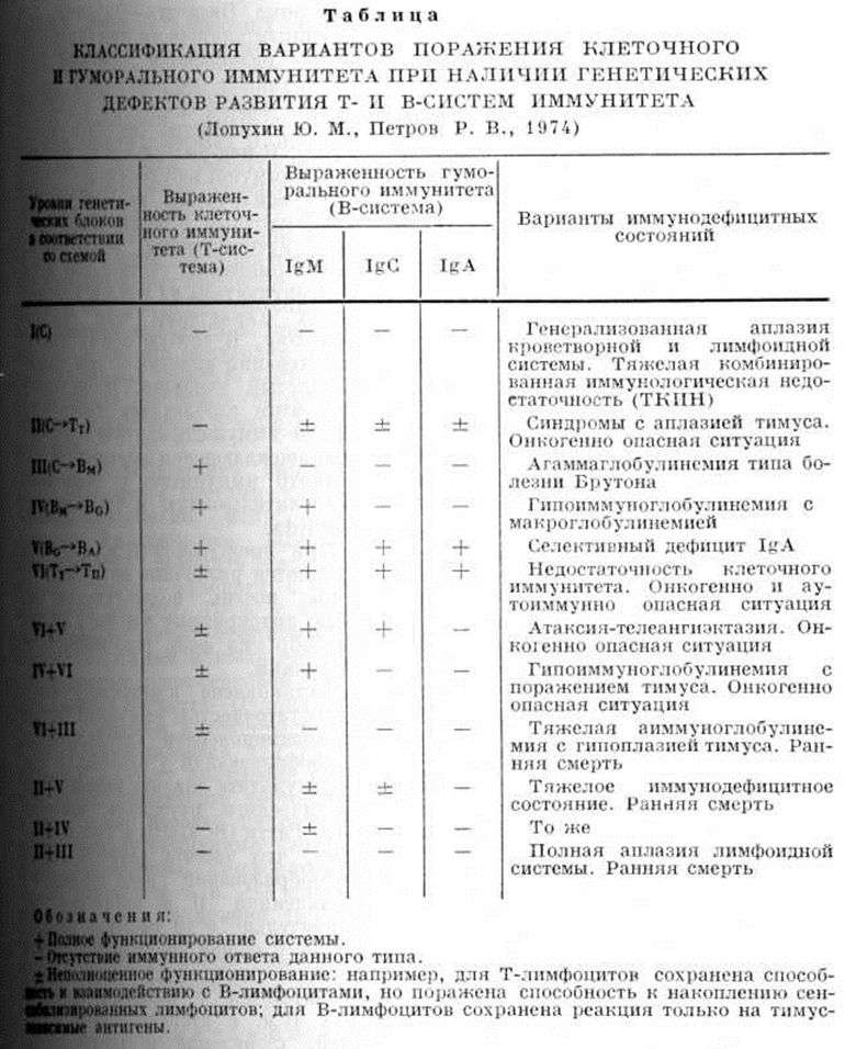 Известно несколько форм тяжёлой комбинированной Иммунологическая недостаточность: аутосомнорецессивная; сцепленная с полом; спорадическая и другие Нередко тяжёлая комбинированная Иммунологическая недостаточность сочетается с дефицитом фермента аденозиндезаминазы. В иммунологический плане тяжёлая комбинированная Иммунологическая недостаточность характеризуется практически полным выключением Т- и В-систем иммунитета в связи с нарушением дифференцировки стволовой кроветворной клетки в Т- и В-лимфоциты. Тимус у больных тяжёлой комбинированной Иммунологическая недостаточность находится на ранней стадии эмбрионального развития, в селезёнке и в лимфатических, узлах отмечается дефицит лимфоцитов и зародышевых центров, в периферической крови лимфопения. Резко угнетены реакции клеточного и гуморального иммунитета. Клиническими проявлениями дефицита Т- и В-систем иммунитета являются тяжёлые рецидивирующие воспалительные процессы (инфекции дыхательного и пищеварительного тракта, молочница), а также отставание в весе и другие. Без лечения дети с тяжёлой комбинированной Иммунологическая недостаточность обычно погибают в первые 6—12 месяцев жизни. Достаточно полно описаны две формы Иммунологическая недостаточность, развивающиеся на фоне аплазии или гипоплазии центрального органа иммунной системы — вилочковой железы: синдром Ди Джорджа и синдром Незелофа. При синдроме Ди Джорджа аплазия вилочковой железы сочетается с аплазией паращитовидных желёз и характеризуется дефицитом Т-системы иммунитета. Нарушено развитие ряда органов, закладывающихся в 3—4-й жаберных дугах: эпителиальный компонент вилочковой железы, паращитовидные железы, часть дуги аорты, рукоятка грудины, мочка уха и другие. У части детей обнаружен порок сердца. В периферических органах иммунной системы дефицит лимфоцитов в тимусзависимых зонах. Угнетены реакции клеточного иммунитета при сохранении гуморального иммунитета. Характерным является тетания, поддающаяся лечению гормоном паращитовидной железы, но не кальцием. Дети с синдромом Ди Джорджа высокочувствительны к кожным инфекциям, инфекциям дыхательного и пищеварительного тракта. Другим вариантом избирательного дефицита Т-системы является синдром Незелофа. У больных с аутосомно-рецессивной формой аплазии вилочковой железы, протекающей без аплазии паращитовидных желёз, наблюдается недоразвитие тимусзависимого компонента периферических органов иммунной системы с глубоким дефицитом реакций клеточного иммунитета; реакции гуморального иммунитета могут быть сохранены. С неонатального периода дети страдают рецидивирующими инфекционными процессами, главным образом вирусной и грибковой этиологии. Селективный дефицит В-системы иммунитета при сохранении реакций клеточного иммунитета развивается у детей с агаммаглобулинемией типа Брутона, сцепленной с полом. Клинически заболевание характеризуется рецидивирующими главным образом пиогенными инфекциями, которые развиваются с середины первого года жизни, когда перестают оказывать защитное действие полученные от матери иммуноглобулины. Наиболее характерны для больных детей конъюнктивиты, отиты, пневмонии и абсцессы, при этом сохраняется резистентность к н-рым грамотрицательным микроорганизмам, вирусам, грибкам. У больных с 