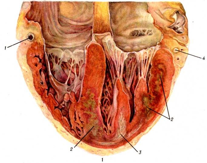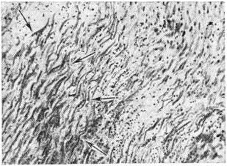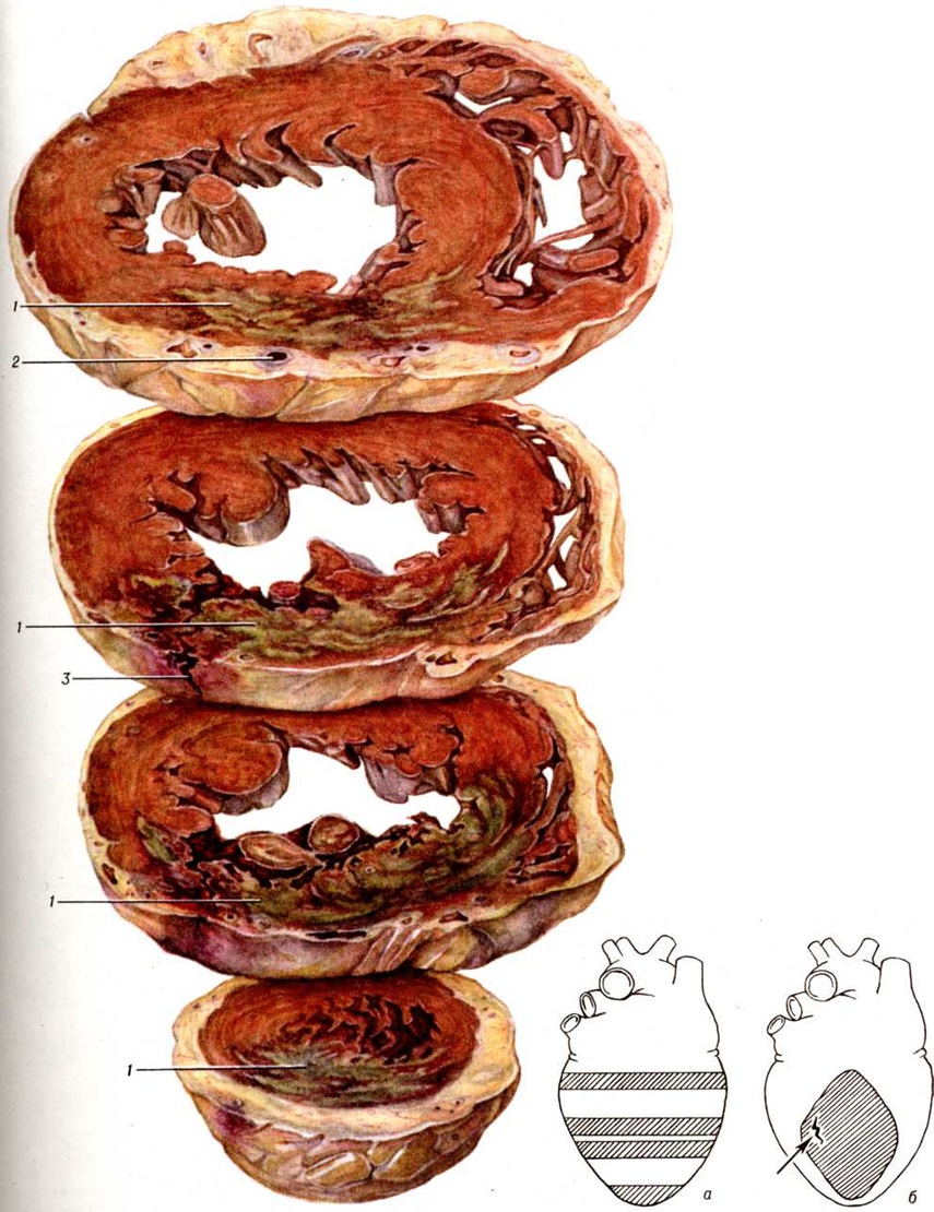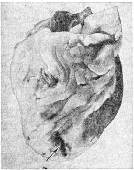 Макроскопически обнаруживаемый в сердце при атипичных Инфаркт миокарда крупный субэндокардиально-интрамуральный, а иногда и трансмуральный некротический очаг по внешнему виду отличается от типичного Инфаркт миокарда пестротой структуры и отсутствием зональности строения. Внешний вид его часто не соответствует длительности клинический. проявлений. В патологоанатомической практике такие очаги обычно расцениваются как организующийся Инфаркт миокарда. Микроскопически такой очаг представляет собой беспорядочно чередующиеся участки фуксинофильной дегенерации и коагуляционного некроза, находящиеся на разных этапах становления и организации, а также участки миолиза, вакуольной, жировой дистрофии, атрофии мышечных волокон (рисунок 7); нередко встречаются и старые рубцовые изменения. В строме очага отмечают расстройства микроциркуляции в виде отёка, полнокровия сосудов, периваскулярных кровоизлияний. Хотя такие Инфаркт миокарда обычно локализуются в зоне кровоснабжения облитерированной или резко стенозированной артерии, ангиографически в них, в отличие от типичного Инфаркт миокарда, отмечается обилие мелких сосудов, образующих густые сплетения (рисунок 8). Иногда в магистральной венечной артерии обнаруживают и свежие тромбы, часто повторные. В этих случаях весь первоначально возникший пёстрый очаг некротизируется и утрачивает морфологический своеобразие. В зависимости от стадии развития Инфаркт миокарда могут выявляться различные его осложнения: разрыв сердца, аневризма, тромбоэмболии, отрыв папиллярной мышцы, перфорация межжелудочковой перегородки, тромбэндокардит и другие. Разрыв миокарда является осложнением раннего периода Инфаркт миокарда, главным образом в первые 3—10 дней (цветной рисунок). Он встречается среди умерших от инфаркта миокарда в 10—15% случаев Решающую роль в возникновении разрыва играют размеры некротического очага — разрыв возникает при обширных трансмуральных инфарктах. Способствуют разрыву артериальная гипертензия и слабое развитие коллатерального кровообращения. При повторных Инфаркт миокарда разрывы наблюдаются реже, чем при первом. Более половины разрывов возникает при инфарктах передней стенки левого желудочка (рисунок 9). Чаще разрыв находится на стыке мёртвого и сохранившегося миокарда в зоне лейкоцитарной реакции и имеет ступенчатый вид. И. В. Давыдовский связывал ступенчатость разрыва с постепенным, а не одномоментным характером разрыва. Редкими осложнениями раннего периода Инфаркт миокарда (1—1,5% летальных исходов) является отрыв некротизированной сосочковой мышцы и перфорация межжелудочковой перегородки. Отрывается обычно одна мышца, причём в 6 раз чаще наблюдается отрыв задней сосочковой мышцы. Разрыв межжелудочковой перегородки, как и разрыв сердца, чаще наблюдается при первом Инфаркт миокарда и при инфаркте, развившемся на фоне артериальной гипертензии. Разрыв межжелудочковой перегородки приводит к развитию острой правожелудочковой сердечной недостаточности. В 20—30% случаев Инфаркт миокарда, преимущественно трансмуральные, осложняются аневризмой сердца (смотри полный свод знаний). Аневризмы чаще локализуются в области передней стенки левого желудочка вблизи верхушки сердца, в задней стенке у основания сердца, реже в области верхушки сердца и в межже