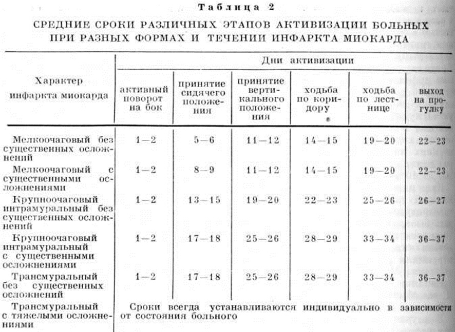 Реабилитация. С первых дней болезни проводятся мероприятия, направленные на предупреждение возможных и лечение возникших осложнений, а также на мобилизацию компенсаторных возможностей организма. Рекомендуется придерживаться следующих сроков пребывания больных Инфаркт миокарда в стационаре: при мелкоочаговом Инфаркт миокарда без существенных осложнений — 20—25 дней, с осложнениями — 25—35 дней; при неосложнённом интрамуральном Инфаркт миокарда — 25—35 дней, с осложнениями — 40—45 дней; при трансмуральном Инфаркт миокарда без существенных осложнений — 40—50 дней, с осложнениями — более 50 дней. Восстановительная терапия включает использование не только медикаментозных препаратов, но и ЛФК, психо и физиотерапевтических, сан.-кур. и других воздействий. Важное значение имеет адватная состоянию физических активность больных Инфаркт миокарда, которая определяется индивидуально для каждого больного. Сроки активизации больных представлены в таблице 2. Диета в первые часы и дни острого Инфаркт миокарда, когда аппетит больного резко снижен, ограничивается фруктовыми соками, минеральной водой, легко усваиваемыми и высококалорийными продуктами. Начиная с 3—4-го дня диету постепенно расширяют за счёт изделий из протёртого мяса, творога и других молочнокислых продуктов, с тем чтобы к 7-му дню заболевания больной был переведён на диету № 10 (смотри полный свод знаний Лечебное питание). Лечебная физическая культура — один из методов в системе восстановительной терапии больных Инфаркт миокарда Она способствует стимуляции вспомогательных, экстракардиальных факторов кровообращения, что способствует облегчению работы сердца, тренировке сократительной функции ослабленной сердечной мышцы, развитию более совершенного приспособления коронарного кровообращения к обменным потребностям миокарда. ЛФК способствует также умеренной активизации дыхания, повышению тонуса нервной системы, улучшению функций желудочно-кишечные тракта, что играет роль и в профилактике гипостатических пневмоний и других возможных нежелательных последствий строгого постельного режима. При проведении ЛФК не должны нарушаться принципы щажения миокарда и обязателен электрокардиографический контроль. Показаниями к началу применения ЛФК являются удовлетворительное состояние больного, отсутствие одышки в покое, прекращение сильных и частых болей в области сердца, снижение повышенной температуры тела, умеренная РОЭ, отсутствие тенденции к снижению артериального давления, отсутствие на ЭКГ данных, указывающих на отрицательную динамику процесса. ЛФК при Инфаркт миокарда — составная часть общего двигательного режима больного; она осуществляется в форме лечебный гимнастики. Расширение двигательного режима и увеличение интенсивности применяемых физических упражнений проводятся строго индивидуально, с учётом возраста, пола больного, обширности инфаркта, динамики заболевания, двигательной активности больного в прошлом. Чем продолжительнее и резче ограничивались движения больного, тем медленнее должно осуществляться расширение двигательного режима. Занятия ЛФК можно начинать при Инфаркт миокарда средней тяжести на 2—3-й день, при более тяжёлых — на 3—7-й и более поздние дни болезни; вначале они проводятся индивидуально в дообеденное время, когда бол