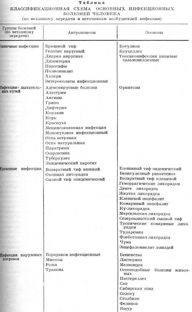 Эта классификация Инфекционные болезни наиболее полно отражает общебиологический характер отдельных болезней и наиболее приемлема для эпидемиологический целей. Однако не все Инфекционные болезни можно с достаточной уверенностью отнести к той или иной группе (например, полиомиелит, лепру, туляремию, вирусную диарею и другие) Но ценность этой классификации и состоит именно в том, что по мере углубления знаний о природе недостаточно изученных болезней каждая из них находит соответствующее место в классификации. В СССР принята Международная классификация болезней. В первый класс классификации включены Инфекционные и паразитарные болезни, которые подразделены на группы по смешанному принципу: 1) кишечные инфекции; 2) туберкулёз; 3) бактериальные зоонозы; 4) другие бактериальные инфекции; 5) полиомиелит и другие энтеровирусные болезни центральная нервная система; 6) вирусные инфекции, сопровождаемые сыпью; 7) вирусные болезни, передаваемые членистоногими; 8) другие вирусные болезни; 9) риккетсиозы и другие болезни, передаваемые членистоногими; 10) сифилис и другие венерические болезни; 11) другие болезни, вызываемые спирохетами; 12) микозы; 13) гельминтозы; 14) другие Инфекционные и паразитарные болезни. В СССР сделаны некоторые отступления от Международной классификации болезней. Так, грипп и другие острые респираторные заболевания отнесены к группе первого класса — Инфекционные болезни (в Международной классификации — к болезням органов дыхания). Для клинический, целей большое значение имеет разработка классификаций, в которых учитываются патогенез, форма и вариант течения болезни, тяжесть состояния, наличие осложнений, исходы. СтатистикаСтатистика необходима для оценки уровня и динамики заболеваемости, определения эпидемиологический конъюнктуры на той или иной территории, выбора действенных мер борьбы с Инфекционные болезни Статистика Инфекционные болезни в СССР регламентирована официальной системой регистрации, учёта и отчётности лечебный-проф. учреждений и органов здравоохранения. На территории СССР обязательной регистрации подлежат заболевания брюшным тифом, паратифом А, В и С, сальмонеллезами, бруцеллёзом, дизентерией, гастроэнтеритами и колитами (кроме язвенных), вирусным гепатитом (раздельно инфекционным и сывороточным), скарлатиной, дифтерией, коклюшем (включая бактериологически подтверждённый паракоклюш), гриппом, аденовирусными болезнями, менингококковой инфекцией, корью, ветряной оспой, паротитом эпидемическим, орнитозом, сыпным тифом и прочими риккетсиозами, малярией, энцефалитами, геморрагическими лихорадками, туляремией, бешенством, столбняком, сибирской язвой, лептоспирозом. При вспышках некоторых Инфекционные болезни и даже единичных заболеваниях карантинными Инфекционные болезни, в случае их появления на территории СССР, установлен особый порядок внеочередных донесений. Система регистрации и учёта подчинена основной задаче — принятию оперативных противоэпидемические мер в очаге болезни. В связи с этим Инфекционные болезни регистрируются по месту обнаружения (обращения) больного, а не по месту его жительства или предполагаемого заражения. Основной регистрационный документ — экстренное извещение (смотри полный свод знаний). Этот первичный документ заполняется и отсылается медработни