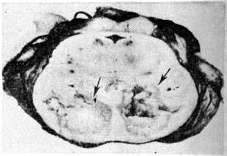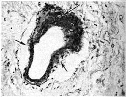 Величина инфаркта мозга зависит от возможностей коллатерального кровообращения, которое включается в момент нарушения кровотока по мозговому сосуду. Наиболее эффективны возможности коллатерального кровообращения при постепенном развитии окклюзирующего процесса во внечерепных сосудах, снабжающих кровью головной мозг; оно осуществляется при этом в основном через артериальный (виллизиев) круг мозга. Поэтому даже полная закупорка внутренней сонной артерии может протекать порой без каких либо клинический, проявлений. Менее благоприятны условия коллатерального кровообращения при разобщении артериального круга и при окклюзии внутричерепных сосудов Включающееся при этом коллатеральное кровообращение по корково-менингеальным анастомозам часто бывает недостаточным. В ряде случаев может возникать относительная недостаточность кровообращения в бассейне сосуда, обеспечивающего коллатеральное кровоснабжение поражённого бассейна (синдром «обкрадывания»). Различают несколько форм синдрома «обкрадывания». При подключичном синдроме «обкрадывания» вследствие закупорки начального отрезка подключичной артерии позвоночная артерия на стороне закупорки функционирует по отношению к руке в качестве коллатерали, по которой в ущерб головному мозгу осуществляется ретроградный ток крови из позвоночных и базилярной артерий в артериальную систему руки. При усиленной работе рукой уменьшается приток крови к мозгу, в результате чего появляются стволовые и другие симптомы. При ишемическом Инсульт реакции артерий в очаге повреждения на сосудорасширяющие и сосудосуживающие влияния отсутствуют либо резко снижены. Поэтому сосудорасширяющие влияния могут приводить к увеличению притока крови только в здоровые области мозга в ущерб кровоснабжению поражённого участка (синдром внутримозгового «обкрадывания»). Напротив, сосудосуживающие влияния, уменьшая порой кровоснабжение здоровых областей мозга, окружающих очаг повреждения, способствуют тем самым перераспределению крови в очаг повреждения (синдром Робина Гуда). Патологическая анатомияТяжесть поражения мозга при Инсульт колеблется от изменений отдельных структурных элементов нервной ткани до образования обширных очагов с грубыми повреждениями мозга. При ишемическом Инсульт развиваются инфаркты (смотри полный свод знаний) — белые, геморрагические, смешанные. При геморрагическом Инсульт различают кровоизлияния типа гематомы и геморрагического пропитывания. Отдельную группу составляют кровоизлияния, возникающие при разрыве врождённых аневризм сосудов мозга. Особую форму представляют также нарушения венозного кровообращения в мозге, протекающие в некоторых случаях инсультообразно. Геморрагический инсульт, как правило, возникает при заболеваниях, протекающих с повышенным артериальное давление. Это обусловлено тем, что сосудистые кризы (смотри полный свод знаний), характерные для гипертонической болезни (смотри полный свод знаний) и артериальной гипертензии (смотри полный свод знаний Гипертензия артериальная), приводят к морфологический изменениям стенок внутримозговых сосудов с нарушением их проницаемости — плазматическому пропитыванию (рисунок 1), некрозам (рисунок 2), образованию микроаневризм (рисунок 3) и их разрывам. Разрыв врождённых артериальных и 
