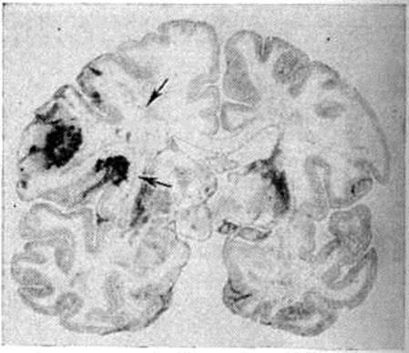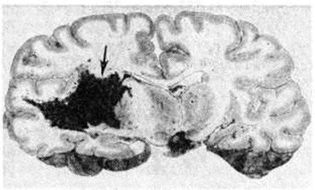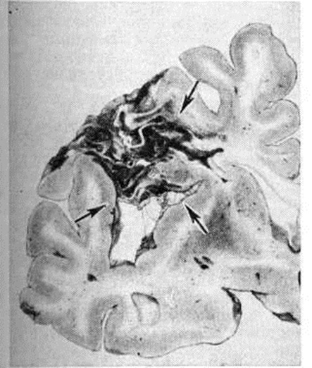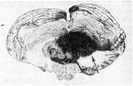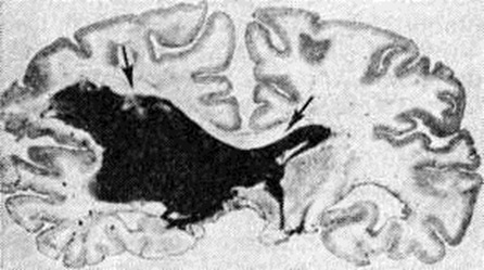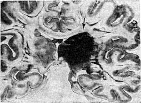 Кровоизлияния типа гематомы сопровождаются образованием полости, содержащей жидкую кровь или свёртки крови; они составляют 85% внутримозговых кровоизлияний, наиболее часто развиваются в подкорковых узлах, реже в мозжечке. Основной механизм развития гематомы — разрыв патологически изменённого сосуда (рисунок 7). Формирование гематомы идёт путём раздвигания кровью вещества мозга с перемещением его участков, что возможно благодаря резервным пространствам (желудочки, подпаутинное пространство). Размеры гематомы при этом превышают объем разрушенного кровью вещества, сдавление окружающих отделов незначительно; лишь при кровоизлиянии в мозжечок сдавление вещества мозга весьма существенно в связи с анатомическими особенностями задней черепной ямки (рисунок 8). Кровоизлияния типа геморрагического пропитывания возникают преимущественно в зрительных буграх, реже в мосту мозга и составляют 15% внутримозговых кровоизлияний. Они являются результатом слияния мелких очагов кровоизлияний, возникающих путём диапедеза из мелких сосудов, имеют вид очагов красного цвета, дряблой консистенции и в силу внешнего сходства иногда напоминают геморрагический инфаркт. В первые часы Инсульт нарушается проницаемость сосудов на границе с кровоизлиянием, развивается отёк; кровь распространяется по ходу нервных волокон. К концу первых суток наблюдаются лейкостазы и лейкодиапедез, размеры очага увеличиваются за счёт диапедезных геморрагий и некробиотических изменений в отёчном веществе мозга. Через двое суток начинается процесс репарации — появление зернистых шаров и гипертрофированных астроцитов; позже образуется вал из астроглии и новообразованных сосудов, кровь подвергается гемолизу, появляются макрофаги с гемосидерином, образуются аргирофильные и коллагеновые волокна. Исходом кровоизлияния может быть формирование глиомезодермального рубца или кисты, содержащих гемосидерин (рисунок 9). В 80—85% кровоизлияний на вскрытии выявляется прорыв крови в желудочки, значительно реже — в подпаутинное пространство. В последнее кровь может также проникнуть из четвёртого желудочка. Первичные вентрикулярные геморрагии нетравматического генеза — явление казуистическое. При разрыве врождённых аневризм артерий основания мозга возникают первичные субарахноидальные кровоизлияния, которые обычно локализуются на базальной поверхности или в латеральной борозде; иногда кровь проникает в субдуральное пространство; часто повреждается вещество мозга (субарахноидально-паренхиматозные кровоизлияния). Расположение гематом, образующихся при этом, зависит от локализации аневризмы, обычно это базальный отдел лобной доли или височная область. В части случаев при незначительном субарахноидально-паренхиматозном кровоизлиянии возможен массивный прорыв крови в желудочки (рисунок 10), что иногда ошибочно диагностируется как первичное вентрикулярное кровоизлияние.