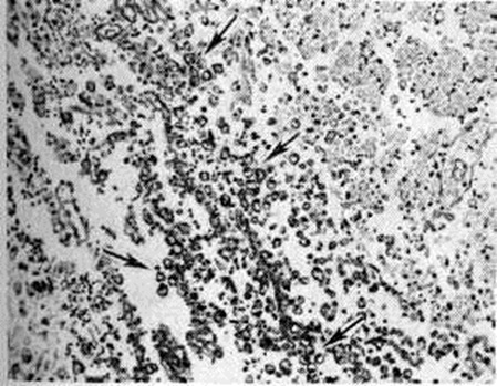 Инфаркты различают по степени геморрагического компонента: белые (серые) инфаркты представлены бледной, дряблой тканью, они составляют 85—90% общего числа инфарктов и могут возникать в любых отделах мозга (рисунок 11 и 12). Геморрагические красные инфаркты имеют вид небольших очагов красного цвета, локализуются только в сером веществе, обычно в коре (рисунок 13), нередко возникают при тромбоэмболиях. Смешанные инфаркты состоят из белых и красных участков, причём последние располагаются преимущественно в лучше васкуляризуемом сером веществе (рисунок 14). При всех видах инфаркта микроскопическое исследование в начальном периоде Инсульт выявляет изменения мозга, обусловленные ишемией: патологию нервных клеток (прежде всего их ишемические изменения — рисунок 15), некробиотические изменения глии. Сосуды более устойчивы к ишемии. Встречаются диапедезные кровоизлияния из мелких сосудов — в очагах серых инфарктов они невелики и единичны, в очагах красных инфарктов и отдельных участках смешанных — они множественные, сливаются между собой. К концу первых суток возникает миграция лейкоцитов, ферменты которых участвуют в расплавлении некротизированной ткани (начало «размягчения»), на 2—3-и суток присоединяется процесс «уборки»; появляются зернистые шары с жиром (рисунок 16), тучные астроциты; организация очага сопровождается пролиферацией волокнистых астроцитов, новообразованием сосудов и коллагеновых волокон и заканчивается образованием глиомезодермального рубца при небольших очагах или соединительнотканных рубцов и многокамерных кист при обширных очагах (рисунок 17). Иногда при стойкой неврологический симптоматике макроскопически не удаётся обнаружить очага полного некроза или рубца; микроскопическое исследование при этом выявляет очаг неполного некроза в коре (гибель нейронов с заместительным астроглиозом). Электронно-микроскопическое исследование коры мозга человека при Инсульт выявляет различные ультраструктурные изменения нейронов, глиальных элементов и капилляров. В ультраструктуре капилляров можно выделить следующие основные патологический изменения: дистрофию стенки капилляра с накоплением в ней лизосомальных включений, липофусциновых гранул, распадом митохондрий, расслоение и вакуолизацию базальной мембраны (рисунок 18). Кроме того, отмечается разрастание и гиперплазия эндотелия. Ультраструктурные повреждения капиллярной стенки сопровождаются разнообразными изменениями из просвета. Обнаруживается ряд изменений основных субмикроскопических компонентов нейронов. Наиболее характерны нейроны, изменённые по гиперхромному типу (рисунок 19), что сочетается с пикнозом ядра, разрушением митохондрий, деструкцией гранулярного и агранулярного ретикулума, наличием большого числа вакуолей и лизосомальных включений, и нейроны с явлениями хроматолиза (рисунок 20), который сопровождается исчезновением цитоплазматических включений, растворением мембранных структур, образованием вместо цистерн ретикулума групп дискретных пузырьков, отсутствием рибосом, набуханием митохондрий, появлением вакуолей. Изменение ультраструктуры капилляров и нейронов сопровождается отёком астроцитарных отростков, скоплением тел глиальных клеток вокруг патологически изменённых элементов. В области расположения патологичес