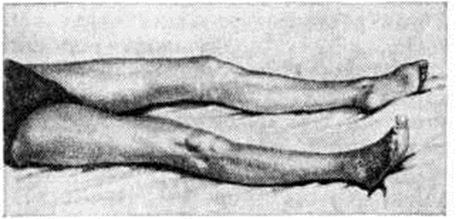 Клиническая картинаГеморрагический инсульт чаще развивается в возрасте 45—60 лет, примерно с одинаковой частотой у мужчин и женщин. Возникает, как правило, внезапно, днём, обычно после волнения или резкого переутомления. Иногда Инсульт предшествуют приливы крови к лицу, головная боль, видение предметов в красном цвете. Начальные симптомы: внезапная головная боль, рвота, расстройство сознания, учащение дыхания, бради или тахикардия, гемиплегия или гемипарез. Глубина нарушения сознания бывает разной — кома (смотри полный свод знаний), сопор, оглушение (смотри полный свод знаний) — и в значительной степени определяется развитием отёка мозга. При развитии комы сознание утрачено, реакция на раздражения отсутствует, глаза закрыты, рот полуоткрыт, лицо гиперемировано, цианоз губ. Часто отмечается пульсация сосудов на шее, дыхание может быть хриплым стерторозным и периодическим, типа Чейна — Стокса (смотри полный свод знаний Чейна — Стокса дыхание), с затруднённым вдохом или выдохом, разноамплитудным, редким. Кожа холодная, пульс напряжённый замедленный, артериальное давление в подавляющем большинстве случаев повышено, зрачки часто бывают изменены по величине (иногда расширен зрачок на стороне кровоизлияния), могут быть «плавающие» или маятникообразные движения и незначительное расхождение глазных яблок, иногда отведение глаз в сторону (парез взора), опущение угла рта и отдувание щеки на стороне паралича (симптом паруса). На стороне, противоположной очагу, часто обнаруживаются симптомы гемиплегии — стопа ротирована кнаружи (рисунок 22), поднятая рука падает, как плеть, выраженная гипотония мышц, снижение сухожильных и кожных рефлексов, симптом Бабинского. Нередко отмечаются менингеальные симптомы, рвота, расстройство глотания, задержка мочи или непроизвольное мочеиспускание. Обширные полушарные кровоизлияния нередко осложняются вторичным стволовым синдромом. Он проявляется прогрессирующими расстройствами дыхания, сердечной деятельности, сознания, глазодвигательными нарушениями, изменениями мышечного тонуса по типу горметонии (смотри полный свод знаний) и децеребрационной ригидности (смотри полный свод знаний), вегетативными расстройствами. Эти симптомы могут появиться сразу после Инсульт или некоторое время спустя.