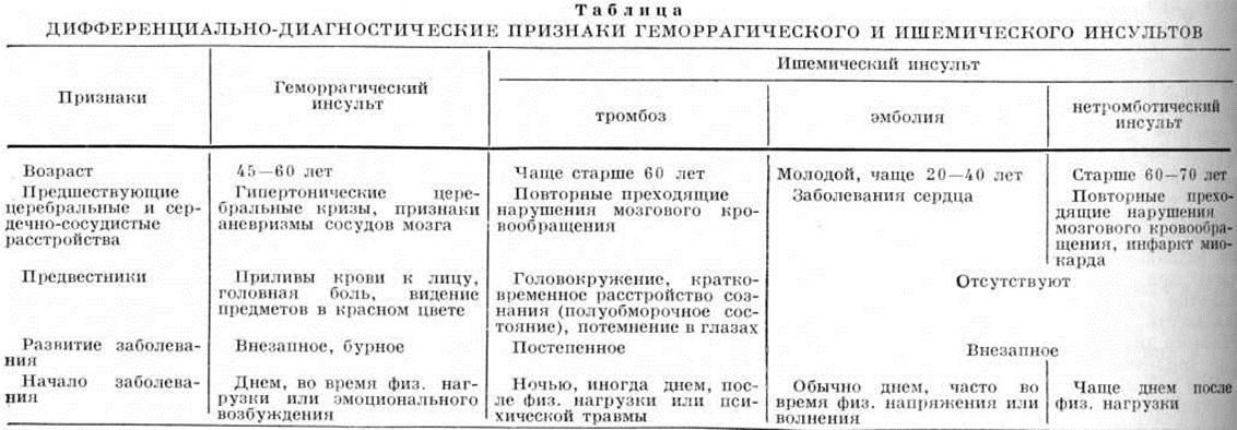 У большинства больных с ишемическим Инсульт наибольшая тяжесть состояния отмечается в первые 2—3 дня. Затем наступает период улучшения общего состояния, который у части больных проявляется некоторой стабилизацией симптомов, у других уменьшением их; при этом темп восстановления нарушенных функций варьирует, он может быть и быстрым и торпидным. Восстановление функций может начаться в первый же день Инсульт или через несколько дней, у некоторых больных лишь через несколько недель. Иногда отмечается тяжёлое течение ишемического Инсульт Летальность наблюдается примерно в 20% случаев. При повторных ишемических Инсульт развивается псевдобульбарный синдром (рисунок 23), прогрессирующие психические расстройства. ДиагнозДиагноз Инсульт ставится на основании: 1) данных анамнеза; 2) клинический, картины; 3) исследования цереброспинальной жидкости; 4) исследования глазного дна; 5) электрокардиографии; 6) реоэнцефалографии; 7) эхоэнцефалографии; 8) электроэнцефалографии; 9) лабораторных исследований крови (система свёртываемости, содержание протромбина, фибриногена, сахара, мочевины и другие); 10) рентгенологическое исследований (краниография, ангиография). Инсульт необходимо дифференцировать с заболеваниями, протекающими апоплектиформно. К их числу относятся: 1) апоплектиформный синдром при инфаркте миокарда (смотри полный свод знаний Кома); 2) апоплектиформное развитие опухоли головного мозга; 3) черепно-мозговая травма в остром периоде (ушиб головы, повреждения кожи и костей черепа); 4) алкогольная интоксикация (дезориентирует запах алкоголя изо рта при Инсульт, развившемся после приёма спиртного); 5) уремия (анурия, вид больного, изменения мочи, азотемия); 6) прогрессивный паралич (смотри полный свод знаний); 7) отравление окисью углерода (смотри полный свод знаний); 8) гипер или гипогликемическая кома (смотри полный свод знаний); 9) геморрагический менингоэнцефалит; 10) эпилепсия (смотри полный свод знаний). Дифференциальная диагностика геморрагического и ишемического Инсульт — смотри полный свод знаний таблицу.