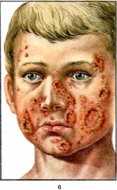 Локализуется Йододерма на лице, шее, конечностях, реже на туловище и волосистой коже головы. При узловатой форме вначале возникают угревидные, инфильтрированные у основания пустулы, сопровождающиеся жжением, зудом; при слиянии пустул образуются опухолевидные инфильтраты в виде узлов сине-багрового цвета, величиной от 0,5 до 3 см в диаметре, в центре которых зачастую возникают пузыри с кровянисто-гнойным содержимым. Узлы болезненны, мягки на ощупь, окаймлены широким воспалительным ободком; увеличиваясь в размерах, они подвергаются размягчению и распаду в центре с образованием язвенной, вегетирующей поверхности, частично покрытой коричневатыми или черно-бурыми корками (цветной рисунок 6).