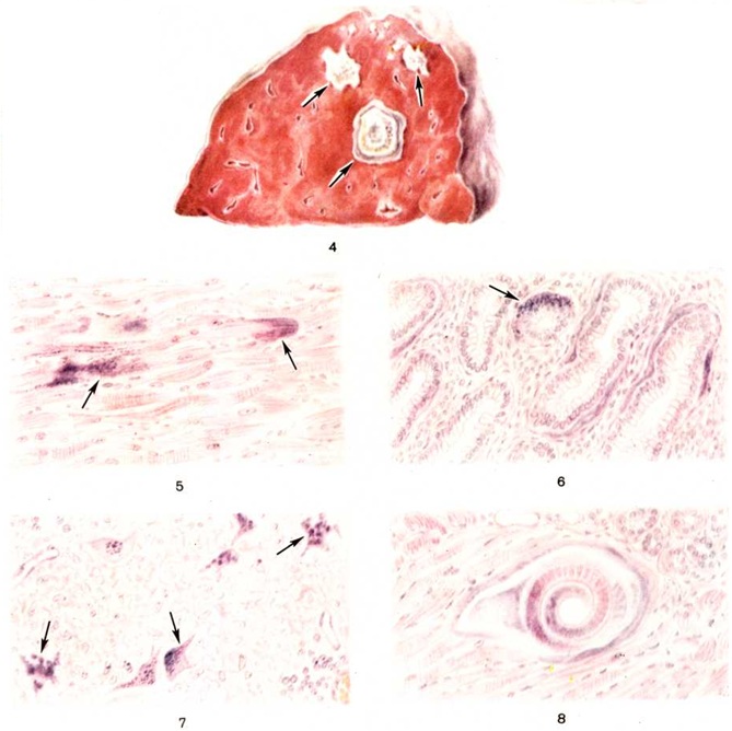 Метастатическое обызвествление (известковые метастазы) возникает при гиперкальциемии (смотри полный свод знаний) в связи с усиленным выходом кальция из депо, пониженным его выведением из организма, нарушением эндокринной регуляции обмена кальция (гиперпродукция паратгормона, недостаток кальцитонина). Этот вид Кальциноз развивается при разрушении костей (множественные переломы, миеломная болезнь, метастазы опухоли), остеомаляции (смотри полный свод знаний) и паратиреоидной остеодистрофии (смотри полный свод знаний), поражении толстой кишки (при отравлении сулемой, хронический дизентерии) и почек (при поликистозе, хронический нефрите), избыточном введении в организм витамина D и другие Известь при метастатическом Кальциноз выпадает в разных органах и тканях, но чаще всего в лёгких, слизистой оболочке желудка, в миокарде (цветной рисунок 5 и 6), почках и стенке артерий, что объясняется особенностью обмена в лёгких, желудке и почках, связанной с выделением кислых продуктов и большой щёлочностью их ткани; эти особенности являются физиологической предпосылкой к обызвествлению.