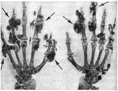 При универсальной форме Кальциноз на снимках видны распространённые крошковидные, линейные или неправильной формы участки обызвествления, которые располагаются в коже, подкожной жировой клетчатке, сухожилиях и мышцах различных участков тела. Эти очаги могут быть изолированными, могут сливаться в отдельные конгломераты, располагающиеся вблизи крупных суставов конечностей, в фалангах пальцев (рисунок 5), мягких тканях бёдер, живота и спины. Опухолевидный интерстициальный Кальциноз — крупные известковые узлы размером около 10 сантиметров, неправильной формы, локализующиеся чаще всего вблизи крупных суставов (рисунок 6), иногда симметрично с обеих сторон. Узлы не связаны с костями, структура костной ткани, как правило, не нарушена, в редких случаях имеется умеренный остеопороз (смотри полный свод знаний). При дифференциальной диагностике следует иметь в виду D-гипервитаминоз, который легко распознается по характерному для него анамнезу. При наличии свищей, иногда возникающих при опухолевидной форме Кальциноз, необходимо исключить туберкулёз, для которого характерны изменения костей, отсутствующие при Кальциноз. От истинной подагры известковая подагра отличается отсутствием болевых приступов.