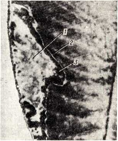 Пигментированное пятно (светло-коричневое) отличается от белого пятна большим размером и глубиной поражения. На шлифах зуба при пигментированном пятне выявляются значительные изменения в подповерхностном слое эмали, в наружном слое деминерализация отсутствует (рисунок 2). Поражение вначале не превышает половины толщины эмали, затем захватывает всю эмаль в глубину. При устранении кариесогенных факторов и стабилизации процесса пятно приобретает темно-коричневый или чёрный цвет. Электронно-микроскопическое исследование кариозного процесса в стадии пятна выявляет ранние изменения в патологический очаге, которые заключаются в потере неорганического вещества по периферии призм, ослаблении межкристаллических связей в эмали, нарушении строгой ориентации кристаллов и изменении их формы и размеров. Гистохимические методами выявлена деградация мукополисахаридов межпризменного органического вещества. В области поражения наблюдается расширение межпризменных пространств (рисунок 3), контуры эмалевых призм обозначаются чётче, резко выражена их поперечная исчерченность, более чётко определяются линии Ретциуса. Нарастание деструктивных изменений ведёт к беспорядочному расположению эмалевых призм, их фрагментации и, в конечном итоге, к превращению эмалевого вещества в бесструктурную, размягчённую массу, насыщенную колониями микробов.
