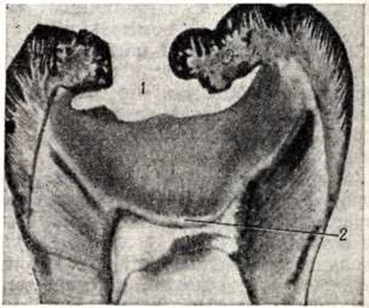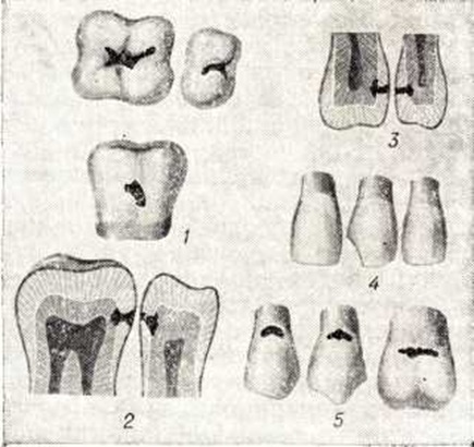 Стадия кариозной полости. По мере распространения патологический процесса на более глубокие слои эмали формируется поражение, имеющее форму треугольника или конуса, обращённого основанием к поверхности зуба. Подвергшаяся деструкции часть эмали отторгается, в результате чего в эмали образуется полость с неровными контурами. Разрушение эмалево-дентинной границы, проникновение микробов в дентинные канальцы обусловливает развитие кариеса дентина. Распространение кариеса на дентин сопровождается дистрофией томсовых волокон; в дентинных канальцах определяется скопление микробов. Под действием выделяющих протеолитические ферменты и кислотообразующих микробов происходит растворение белкового вещества и деминерализация дентина. Этот процесс вначале происходит в окружности канальцев, что выражается их неравномерным расширением, затем процесс распространяется и на другие участки дентина. По данным гистохимические исследования, непосредственным объектом воздействия бактериальных протеаз в дентине является его коллагеновая основа. В области кариозного поражения дентинные канальцы расширены, частью чёткообразно вздуты (рисунок 4), местами сливаются, образуя микро и макрокаверны, содержащие некротические массы и обильное скопление микробов. В дальнейшем наблюдается отторжение значительных масс некротизированного дентина и углубление конусообразной полости с неровными стенками. По периферии кариозной полости по направлению к пульпе зуба дентинные канальцы расширяются и деформируются; они интенсивно окрашиваются гематоксилином в виде темных полос. Глубже располагается слой уплотнённого прозрачного (зона гиперминерализации) дентина со значительно суженными дентинными канальцами и ещё глубже — слой неизменённого дентина. На поздних стадиях процесса разрушается и этот слой дентина, в результате чего устанавливается сообщение кариозной полости с полостью зуба (пенетрирующий кариес). При кариесе в пульпе зуба наблюдают широкий спектр реактивных и дистрофических изменений, свидетельствующих о тесной функциональной связи твёрдых и мягких зубных тканей: пикноз ядер одонтобластов, атрофия, дезорганизация и вакуолизация слоя одонтобластов, ретикулярная атрофия и кистозное превращение пульпы, отложение в пульпе петрификатов и образование заместительного дентина. Реактивное образование заместительного (иррегулярного) дентина происходит непосредственно под кариозной полостью в твёрдых тканях зуба (рисунок 5). Продукция этого слоистого, с неправильно расположенными канальцами дентина более выражена, когда кариозный процесс развивается медленно. Образование заместительного дентина в какой-то мере отдаляет срок перфорации дна кариозного дефекта, но не предотвращает её, так как кариес в дальнейшем распространяется и на заместительный дентин, причём скорость кариозного процесса обычно превосходит темпы образования репаративного дентина. КлассификацияРазличают Кариес зуба по локализации, глубине поражения, характеру клинический, течения и другие. В зависимости от поражённой ткани выделяют кариес эмали, дентина, цемента; по локализации — кариес фиссурный, кариес соприкасающихся поверхностей (апроксимальный, или контактный) и пришеечный. Классификация по локализации определяет метод формирования ка
