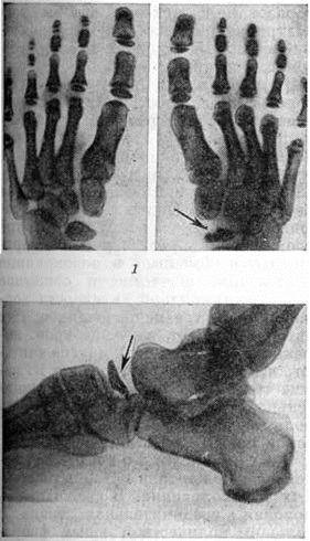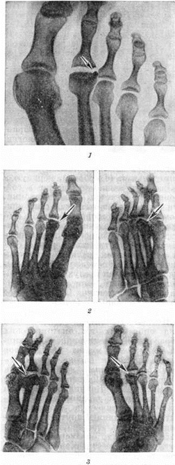 Диагноз. В первой стадии субхондрального асептического некроза отмечают небольшое уплотнение структуры костной ткани одной из головок плюсневых костей. Вторая стадия характеризуется уплощением суставной поверхности головки и увеличением плотности её костной ткани (рисунок 2, 1). Степень деформации головки плюсневой кости колеблется от небольшого выпрямления суставной поверхности до значительного уменьшения высоты головки. В этот период отчётливо определяется расширение суставной щели смежного плюснефалангового сустава. Третья стадия — стадия рассасывания некротической костной ткани — рентгенологически проявляется в виде фрагментации головки плюсневой кости (рисунок 2,2). Форма, величина и плотность фрагментов различны. Контуры их неровные, зазубренные или подчёркнуто чёткие. Суставная щель остаётся расширенной. Вслед за рассасыванием некротических масс следует репарация костной ткани (четвертая стадия) — исчезновение фрагментов и восстановление однородного рисунка структуры деформированной головки; структура её образована грубыми утолщёнными костными балками. Головка приобретает блюдцеобразную форму с углублением в центре и выступающими в сторону краями. В результате уплощения головки наступает укорочение плюсневой кости. Суставная щель суживается и имеет неравномерную ширину. Исходом остеохондропатии головок плюсневых костей является развитие деформирующего артроза — пятая стадия (рисунок 2, 3). Вдоль деформированной головки плюсневой кости появляются гребневидные и бахромчатые костные разрастания. В этот период особенно отчётливо определяется деформация смежной поверхности основной фаланги за счёт уплощения её основания и краевых костных разрастаний.
