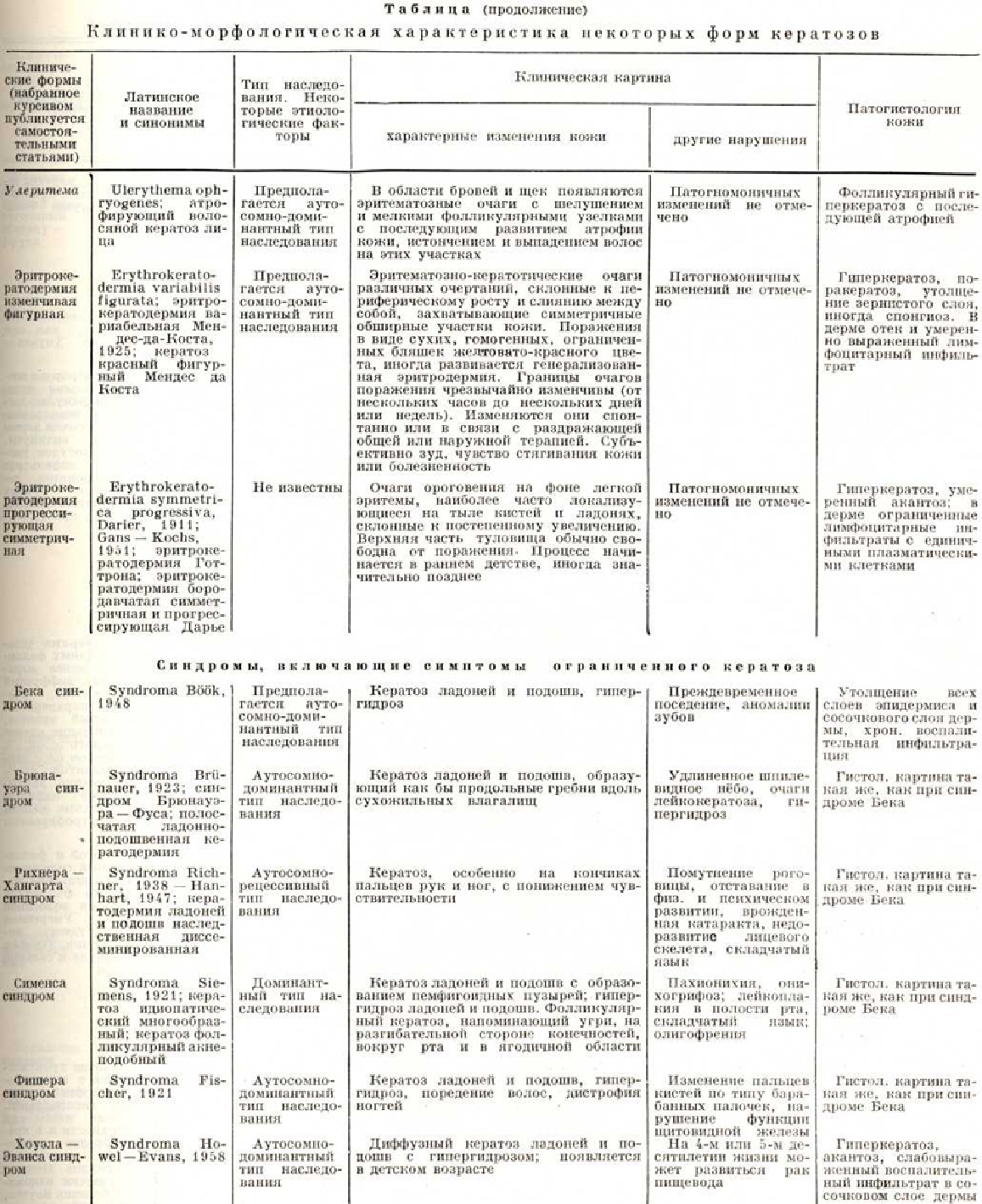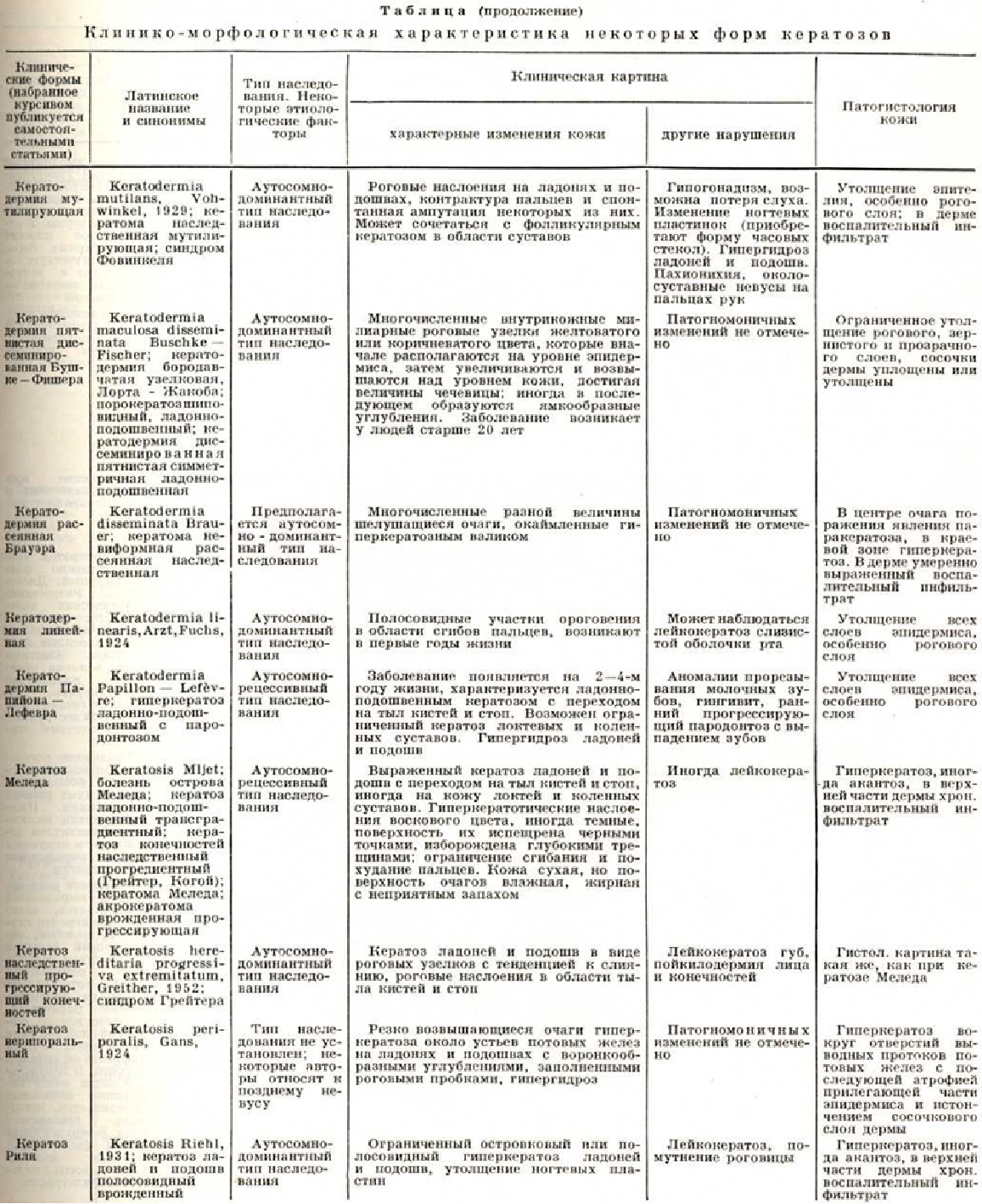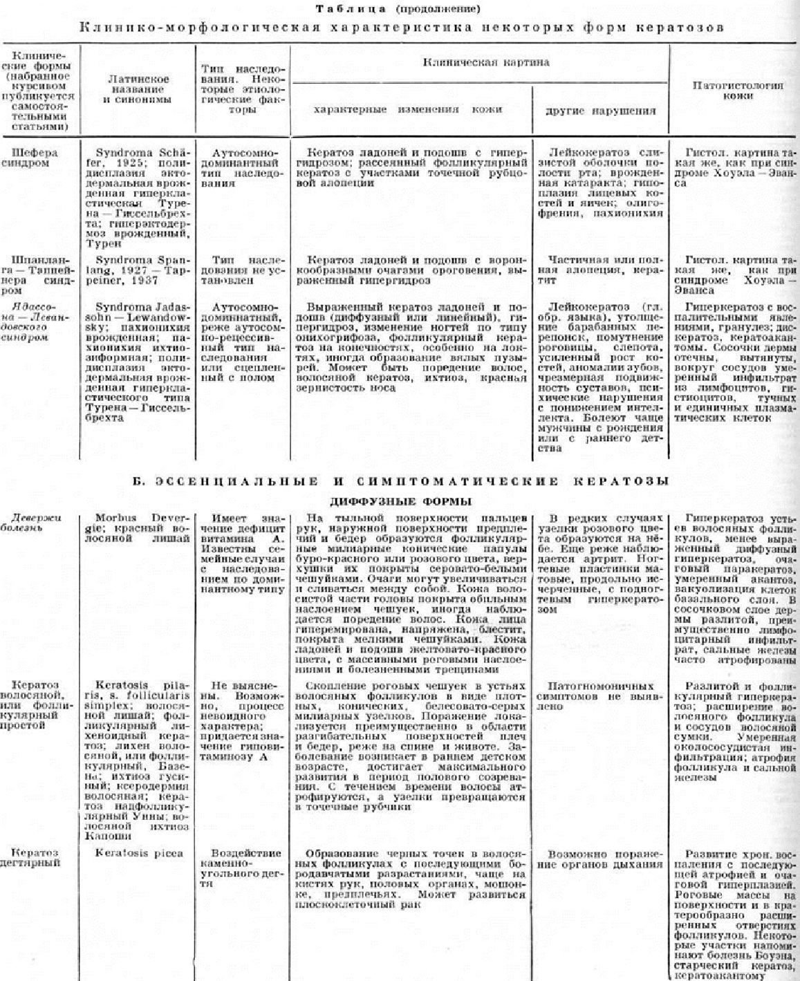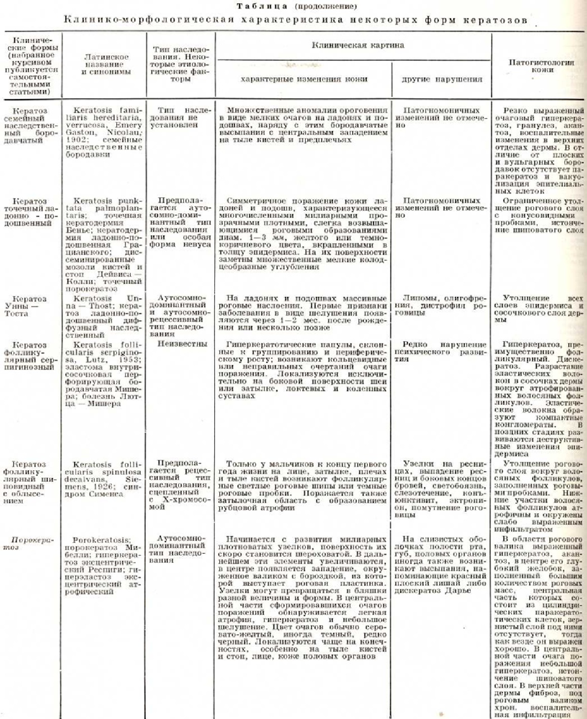 По этиологического признакам Кератозы можно разделить на: 1) наследственные; 2) эссенциальные — приобретённые Кератозы неясной этиологии; 3) симптоматические, являющиеся симптомом другого заболевания или возникающие в результате воздействия экзогенных факторов. Патогистология кератозов характеризуется следующими общими признаками: гиперкератозом, акантозом; в сосочковом слое возможны различной степени выраженности воспалительные инфильтраты, преимущественно вокруг сосудов. Подробнее патология кожи отдельных форм Кератозы дана в таблице. Наследственные кератозы составляют самую многочисленную и разнообразную группу. Наиболее часто встречаются ладонно-подошвенные Кератозы, или кератодермии. Акрокератоз бородавчатый— многочисленные полигональные гиперкератотические бородавчатоподобные невоспалительные узелки красновато-бурого цвета только на тыльной поверхности кистей и стоп (рисунок 1). Дерматоз представляет собой редкую разновидность твёрдого эпидермального бородавчатого невуса; начинается в раннем детстве и не исчезает в течение всей жизни, не вызывая субъективных расстройств; наблюдаются семейные случаи. От бородавчатоподобной эпидермодисплазии (смотри полный свод знаний Эпидермодисплазия верруциформная) отличается отсутствием бородавчатых вегетаций на лице; при дифференциальной диагностике следует иметь в виду также плоские бородавки и Кератозы тыла кистей при болезни Дарье (смотри полный свод знаний Дарье болезнь). Кератоз наследственный ладонно-подошвенный описывается часто под названиями «наследственная кератодермия», «акрокератома наследственная», «ладонно-подошвенный ихтиоз», «симметричный наследственный кератоз». Кератозы характеризуется симметричным поражением ладоней и подошв (в том числе пальцев рук и ног) в виде чётко ограниченных роговых наслоений и усилением узора кожных бороздок. Роговые массы состоят из широких, плотно спаянных, сухих, жёстких, жёлто-восковидных или коричневатых пластинок, достигающих иногда 1 сантиметров в толщину. Поверхность очага поражения вследствие потери эластичности кожи испещрена многочисленными, разной глубины, иногда кровоточащими трещинами. В стадии максимального развития Кератозы роговые массы приобретают черноватую окраску; создаётся значительное затруднение при движении; притупляется чувствительность. В области кератоза — гипергидроз (смотри полный свод знаний). Нередко по краю роговых наслоений видна стойкая эритематозная или сине-багровая кайма шириной 4—5 миллиметров. Очаг поражения может распространиться на тыльную и боковые поверхности кистей и стоп, область коленных суставов, локтевых сгибов и суставных складок. Иногда процесс ограничивается поражением рук и стоп в виде отдельных островков или штриховидных очагов. Кератодермия Папийона — Лефевра (М. М. Раpillon, P. Lefevre, 1924) проявляется на 2—4-м году жизни. Гиперкератоз локализуется на ладонях и подошвах, иногда переходит на тыл кистей и стоп. У больных наблюдаются аномалии прорезывания зубов, гингивит, быстро прогрессирующий пародонтоз с выпадением зубов (смотри полный свод знаний Лефевра—Папийона синдром). Кератоз точечный ладонно-подошвенный — симметричное поражение подошв и ладоней в виде многочисленных диссеминированных или сгруппированных милиарных прозрачных, п