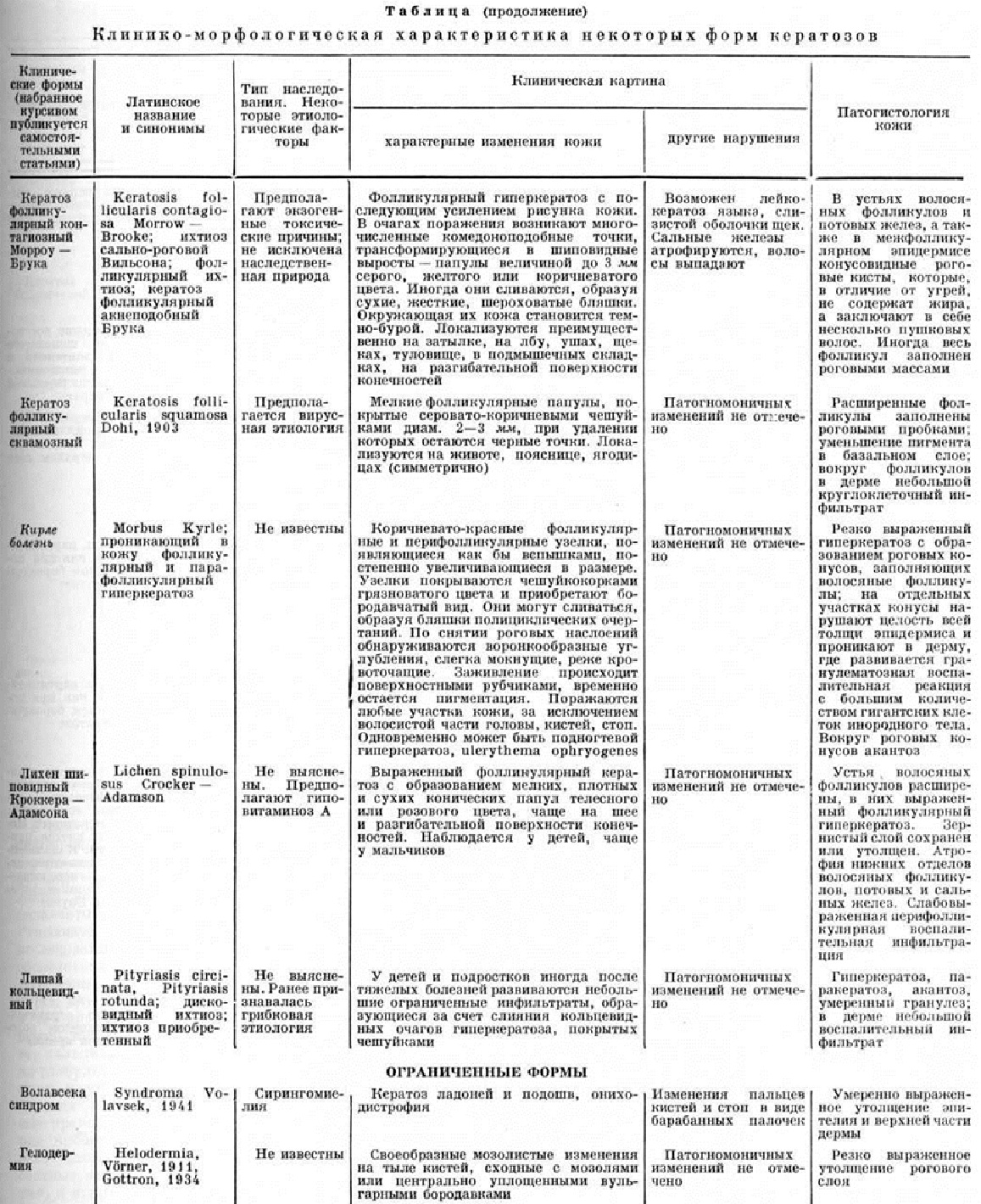 Эритрокератодермия изменчивая фигурная описана Мендес-да-Коста (S. Mendes da Costa, 1925). Редкая разновидность Кератозы, обусловленная, по-видимому, доминантным геном различной экспрессивности. Заболевание начинается обычно в раннем детстве или вскоре после рождения, иногда наблюдается у нескольких членов семьи. Основным клинический, симптомом кожных поражений являются эритематозно-кератотические очаги фигурных очертаний (рисунок 2) в виде сухих гомогенных желтовато-красноватых ограниченных бляшек. Очаги склонны к периферическому росту и слиянию, симметрично захватывают обширные участки кожи. Иногда может развиться генерализованная эритродермия. Границы очагов поражения на протяжении нескольких часов или недель изменяются спонтанно либо под влиянием раздражающей терапии или интеркуррентных заболеваний; иногда наблюдается экзематизация. Субъективно — зуд, чувство стягивания и болезненность. Многие авторы считают, что эта форма Кератозы клинически неоднородна; в ней можно выделить такие разновидности, как кокардовидный генодерматоз Дегоса (1947; синонимы эритематозно-сквамозный цирцинарный вариабельный генодерматоз), характеризующийся эритематозными участками с шелушением в центре на коже ягодиц и голеней, а также парциальную эритрокератодермию Базекса — Дюпре (синонимы: эритема цирцинарная вариабельная, эритема рифициальная врождённая с гипотрихозом). Эритро кератодермия прогрессирующая симметричная описана впервые Ж. Дарье в 1911 год. Этиология неизвестна, возможно, это атипичная абортивная форма ихтиоза. Характеризуется фиксированными очагами избыточного ороговения на фоне лёгкой эритемы, локализующимися преимущественно на тыле кистей, на стопах. Очаги имеют тенденцию к постепенному увеличению, выходя при этом за пределы кистей и стоп. Заболевание начинается в раннем детстве, иногда значительно позже. Эссенциальные кератозы — группа приобретённых Кератозы неясной этиологии. Некоторые эссенциальные Кератозы встречаются у членов одной семьи и носят, возможно, поздний невоидный характер. Их возникновение может быть связано с воздействием эндогенных факторов. Кератоз идиопатический возникает в период половой зрелости или позднее, характеризуется отдельными островками гиперкератоза на пятках над головками плюсневых костей, а также на ладонных и подошвенных сторонах всех пальцев. Этому нередко предшествуют на протяжении нескольких лет усиленная потливость, крапивница, краснота с эксфолиативным шелушением, акроцианоз и тому подобное. Кератоз волосяной, или фолликулярный простой, характеризуется скоплением роговых чешуек в устьях волосяных фолликулов; чешуйки образуют плотные, конические, белесовато-серые узелки величиной от булавочной головки до конопляного зерна. Кожа сухая, жёсткая, шероховатая, при поглаживании создаётся впечатление тёрки. Болезнь начинается обычно в раннем детском возрасте и достигает максимального развития к периоду половой зрелости. Кератозы существует стойко в течение многих лет; зимой сыпь усиливается, летом состояние улучшается, видимо, в связи с повышенным выделением пота, инсоляцией и насыщением организма витаминами. При интенсивной выраженности фолликулярные элементы у основания имеют синевато-багровый или фиолетовый цвет. Сероватые плотные роговые массы, закрыв