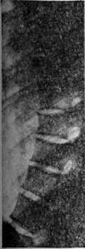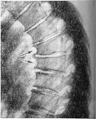 Диагноз. Правильнее говорить не о диагностике Кифоз, а о распознавании болезней или состояний, одним из симптомов которых и является Кифоз Основное значение в диагностике Кифоз наряду с клиническим имеет рентгенологическое исследование. Снимки производят лёжа, в двух проекциях — переднезадней и боковой. Для выявления степени подвижности позвоночника производят снимки стоя и лёжа, а также при наклоне кпереди и кзади. Рентгенодиагностика врождённого Кифоз у детей младше 2 лет затруднена, так как в этом возрасте ещё нет полной оссификации тел позвонков. В более позднем возрасте чётко определяются угловое искривление позвоночника и наличие клиновидного позвонка (рисунок 6). При конкресценции тел позвонков на снимке видно сращение нескольких тел между собой, в основном в передних отделах, и кифотическое искривление позвоночника (рисунок 7). При болезни Шейерманна — May характерно уплотнение поражённых позвонков. В поздних стадиях этого заболевания развивается вторичный деформирующий спондилез (рисунок 8). Старческий Кифоз рентгенологически выражается дугообразным искривлением нижней половины грудного отдела (рисунок 9). Искривление может распространяться на верхнюю половину грудного отдела и на верхние поясничные позвонки. Этот вид Кифоз сочетается с выраженным распространённым остеопорозом (смотри полный свод знаний), а часто и с деформирующим спондилёзом (смотри полный свод знаний). Тела позвонков на боковой рентгенограмме нередко представляются уплощёнными, больше в их передних отделах. Инволютивные изменения при старческом Кифоз происходят и в межпозвоночных дисках, что на рентгенограмме отображается в виде сужения межпозвоночных пространств. При болезни Бехтерева дугообразный кифоз является лишь компонентом богатой рентгенологическое симптоматики этой болезни (смотри полный свод знаний Бехтерева болезнь). Рентгенодиагностика при туберкулёзном кифозе — смотри полный свод знаний Спондилит.