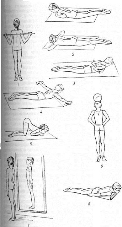 Лечение. Терапевтические мероприятия по поводу Кифоз являются составной частью комплексного лечения основного заболевания, вызвавшего кифотическую деформацию позвоночника. При мобильном Кифоз эффективно консервативное лечение: лечебный физкультура, массаж мышц спины, физиотерапевтические процедуры, плоская постель или гипсовая кроватка с реклинирующим валиком; иногда назначают корсет. Фиксированный Кифоз в ряде случаев удаётся путём вытяжения и корригирующих упражнений перевести в мобильную форму. Однако удержать достигнутую коррекцию без операции практически не удаётся. При свежих Кифоз туберкулёзной этиологии эффективен метод Финка: постоянное давление на верхушку горба ватно-марлевыми прокладками в гипсовой кроватке. Метод применяется преимущественно для лечения детей с начальными формами туберкулёзного спондилита. В лечении Кифоз большое значение имеет лечебный физкультура (рисунок 10). Коррекция Кифоз с помощью специальных упражнений ЛФК показана при многих его формах, за исключением кифотической деформации на почве деструктивных процессов (активный туберкулёзный спондилит, остеомиелит или опухоль). физический упражнения при Кифоз направлены на коррекцию деформации, укрепление мышц спины, выработку ортостатического положения тела и равновесия между физиол. кривизнами позвоночника, улучшение функции дыхательного аппарата, а также общеукрепляющее воздействие. Упражнения выполняют, как правило, лёжа, то есть при разгрузке позвоночника. Показаны следующие виды физических упражнений: 1) разгибания туловища («напряжённые выгибания»); 2) упражнения, мобилизирующие позвоночник в грудном отделе; 3) упражнения, вытягивающие позвоночник; 4) упражнения, расширяющие грудную клетку и растягивающие ретрагированные грудные мышцы; 5) упражнения, вырабатывающие правильную осанку. Мобилизация грудного отдела позвоночника достигается с помощью упражнении, выполняемых в положении на четвереньках; используют упражнения в ползании, а также на месте типа «подлезания». К числу упражнений с вытяжением позвоночника относятся упражнения на гимнастической стенке (так называемый висы). Для выработки правила ной осанки используют упражнения в балансировании с выпрямленным туловищем — стоя на месте и при ходьбе с мячом на голове, а также упражнения — позы, способствующие «самокоррекции» со зрительным контролем перед зеркалом. Лечебный физкультуру при Кифоз сочетают с ручным массажем мышц спины и занятием некоторыми видами спорта. Особенно показано плавание на спине, так как оно способствует коррекции Кифоз, улучшению функции дыхания, укреплению мышц спины. Результат, достигнутый физических упражнениями, закрепляется «лечением положением», то есть кратковременным (15—20 мин.) сохранением больным положения достигнутой коррекции Кифоз. С этой целью используется положение лёжа на груди на клиновидной подставке из дерева или на плотной подушке, либо лёжа на спине с разведёнными в стороны руками на небольшом ватном валике в межлопаточной области. Первые попытки оперативного лечения углообразного Кифоз относятся к концу 19 век и принадлежат Кало (J. F. Calot), который для лечения больных с туберкулёзным спондилитом применил этапную реклинацию (расклинивание) путём рассечения дисков на вершине деформации. Современное опера