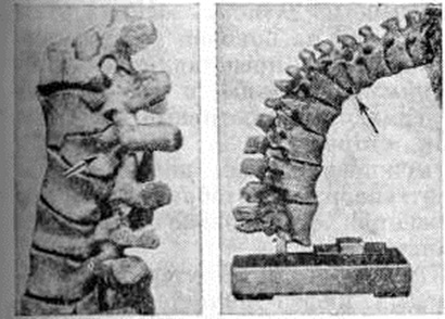 Рахитический Кифоз в прежние времена встречался значительно чаще: он проявляется в младенческом возрасте, когда ребёнок начинает сидеть. В этом случае Кифоз обычно охватывает все отделы позвоночника, бывает дугообразным, нефиксированным, полностью исправляется в положении лёжа. Кифотическая деформация позвоночника типична для туберкулёзного спондилита. Наиболее поражённый процессом позвонок смещается кзади, вышележащий отдел позвоночника наклоняется вперёд, при этом на различных уровнях грудного отдела позвоночника развивается углообразный горб (рисунок 4). При болезни Бехтерева Кифоз имеет дугообразную форму, фиксирован, возникает в возрасте 30—40 лет, значительно чаще у мужчин. Сначала деформация развивается в грудном отделе; в конечной стадии заболевания спина больного образует непрерывную дугу от основания черепа до крестца. При Кифоз, вызванном разрушением позвонка остеомиелитическим процессом (смотри полный свод знаний Остеомиелит), превалируют симптомы острого гнойного воспаления, Кифоз чаще углообразный, в хронической стадии образуются свищи. Для клиники Кифоз, вызванного первичными или метастатическими опухолями позвоночника, характерны боли, Кифоз развивается в поздней стадии — при разрушении и компрессии тела позвонка, часто присоединяются неврологические нарушения. Кифоз при значительной травматической компрессии тела одного позвонка имеет углообразную форму. При переломе нескольких позвонков, даже при незначительной компрессии каждого из них, может образоваться дугообразный Кифоз. Такой Кифоз имеет фиксированный характер. Кифоз может развиться в результате расширенной ламинэктомии с резекцией дужек и суставных отростков позвонков (рисунок 5). В результате ослабленных задних элементов позвонков иногда развивается горб даже в поясничном отделе позвоночника, где в норме имеется лордоз. Старческий, или инволютивный, Кифоз развивается в результате дистрофических изменений межпозвоночных дисков и перестройки костной ткани тел позвонков. Происходит это на фоне выраженного остеопороза позвоночника, причём тела позвонков при незначительных травмах, а в ряде случаев и без них приобретают клиновидную форму, а межпозвоночные диски истончаются. Такой кифоз имеет дугообразную форму. Осложнения наблюдаются при тяжёлых прогрессирующих формах Кифоз Формирование Кифоз приводит к сужению позвоночного канала, особенно на вершине горба, за счёт так называемый клина Урбана, образованного остатками разрушенных тел позвонков. Развивается сначала компрессия корешков, в дальнейшем могут быть парезы и параличи нижних конечностей, нарушение функции тазовых органов. Неврологический спинномозговые и корешковые расстройства редко связаны с механическим сдавлением соответствующих нервных образований при Кифоз Чаще имеет место вторичный перипахименингит и рубцовое сдавление спинного мозга и его сосудов.