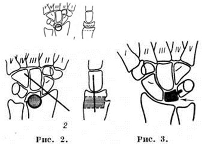 С целью уточнения характера изменений в кости, особенно в начальных стадиях развития патологический процесса, целесообразно применение томографии (смотри полный свод знаний) и рентгенографии с прямым увеличением изображения. Дифференциальный диагноз проводят со стенозирующим лигаментитом (смотри полный свод знаний Тендовагинит), глубоким ганглием (смотри полный свод знаний), с повреждением полулунно-ладьевидной связки, подвывихом полулунной кости, с фиброкистозным дефектом. По клинико-рентгенологическое картине Кинбека болезнь следует дифференцировать с изолированными поражениями полулунной кости туберкулёзного, опухолевого или воспалительного происхождения. При туберкулёзном остите и изолированном ревматоидном поражении полулунная кость деформирована и уменьшена в размерах за счёт деструкции, а не сплющивания и фрагментации, как это имеет место при Кинбека болезнь Воспалительный процесс характеризуется остеолитическими изменениями с разрежением рисунка структуры, тогда как при Кинбека болезнь плотность костной ткани повышена. Лечение длительное время ограничивалось консервативными мероприятиями (иммобилизация, физиотерапия) или удалением полулунной кости. Иммобилизация в циркулярной гипсовой повязке в течение 2— 3 месяцев приемлема только на ранних стадиях при «доброкачественном» течении заболевания; в поздних стадиях иммобилизация лишь уменьшает боль и временно приостанавливает разрушение полулунной кости. Удаление полулунной кости как самостоятельная операция себя не оправдало. Не позднее II —III стадии заболевания рекомендуют операции с укорочением лучевой кости или удлинением локтевой кости; результаты этих вмешательств не всегда надёжны и стойки. То же можно сказать об частичной экскохлеации полулунной кости с пломбировкой полости губчатой костью. Эффективным методом оперативного лечения Кинбека болезнь являются частичные артродезы (смотри полный свод знаний) кистевого сустава: полулунно-лучевые, запястные, лучезапястные и другие. Применяется выполнение частичных артродезов посредством цилиндрической костной пластики по Ашкенази (рисунок 2). При полных разрушениях полулунной кости, когда сохранить её не представляется возможным, производят реконструктивно-восстановительные операции. Немало сторонников находит метод замещения полулунной кости силиконовыми эндопротезами (рисунок 3); однако эндопротезирование (смотри полный свод знаний) не может быть рекомендовано лицам, выполняющим тяжёлую ручную работу. Благоприятные результаты приносят реконструктивные операции с перемещением головки головчатой кости и частичным артродезом запястья (рисунок 4). Иммобилизация после оперативных вмешательств продолжается от в до 12 недель Восстановительное лечение включает лечебный гимнастику, массаж, тёплые ванны. Для профилактики деформирующего артроза у части больных показано сан.-кур. лечение спустя 4—6 месяцев после операции. Прогноз. Течение и исход Кинбека болезнь предсказать трудно. Полное выздоровление даже при рано распознанных поражениях наблюдается редко. Повторные перегрузки или травмы кистевого сустава приводят к прогрессированию деформации полулунной кости, к усилению функциональный расстройств. Если Кинбека болезнь распознана в поздних стадиях у лиц, занимающихся фи