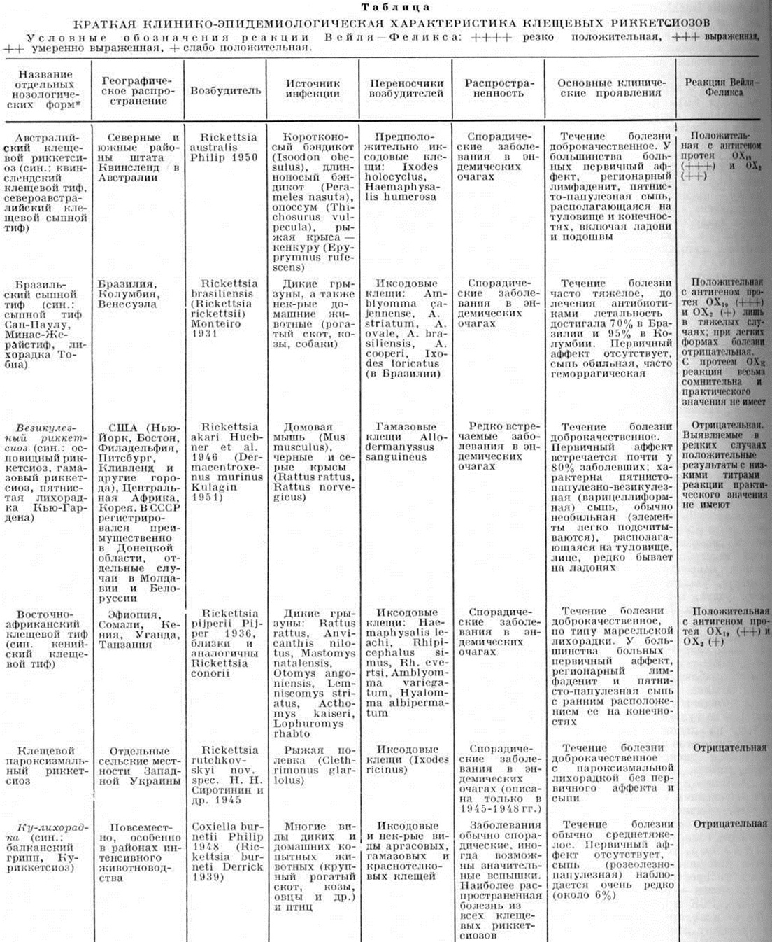 Иммунитет. В течение болезни происходит иммунологический перестройка организма больных с формированием обычно стойкого иммунитета, выявляемого с помощью реакций агглютинации, гемагглютинации и РСК. Клинические проявления при Клещевые риккетсиозы характеризуются острым циклическим течением с интоксикацией, нередко тифозным состоянием, поражением центральной нервной системы и сосудистой системы. Часто наблюдаются гипотензия и гепатолиенальный синдром. При марсельской лихорадке, южно и восточноафриканском клещевых тифах, североазиатском клещевом риккетсиозе, австралийском клещевом риккетсиозе, везикулёзном риккетсиозе и цуцугамуши характерно наличие первичного аффекта, или «чёрного пятна» (на месте введения риккетсий клещом), регионарного лимфаденита, полиаденопатии и типичной экзантемы. Последняя имеет в известной мере дифференциально-диагностическое значение с учётом её характера и распространения при каждой из нозологический форм. Если, например, при эпидемическом сыпном тифе смотри полный свод знаний Сыпной тиф эпидемический), блошином эндемическом тифе смотри полный свод знаний Блошиный тиф эндемический) и окопной лихорадке (смотри полный свод знаний) сыпь первоначально появляется на туловище и затем уже распространяется на конечности, то при Клещевые риккетсиозы, кроме Ку-лихорадки и клещевого пароксизмального риккетсиоза, при которых сыпь почти не встречается, она состоит из пятнисто-папулезных элементов, появляется сначала на конечностях, а затем распространяется на туловище. При пятнистой лихорадке Скалистых гор розеолезно-папулезная или даже геморрагическая сыпь распространяется на туловище и конечности, в том числе на ладони и подошвы. При везикулёзном риккетсиозе сыпь представляется варицеллиморфной, напоминая сыпь при ветряной оспе. Диагноз при большинстве Клещевые риккетсиозы основывается на особенностях клиники: наличии характерной сыпи, первичного аффекта, регионарного лимфаденита, а также на динамике специфических антител в сыворотке крови больных. При пятнистой лихорадке Скалистых гор и Ку-лихорадке, при которых отсутствует первичный аффект, регионарный лимфаденит, а при Ку-лихорадке даже сыпь, в установлении диагноза наиболее важное значение придаётся специфическим серо л. тестам, к числу которых относятся РСК смотри полный свод знаний Реакция связывания комплемента) и реакция непрямой (пассивной) гемагглютинации — РНГА смотри полный свод знаний Гемагглютинация). Не теряет своего значения и реакция Вейля — Феликса, когда в качестве диагностикума применяется антигенно близкий к риккетсиям микроорганизм — протей (Proteus vulgaris), в частности штаммы ОХ19, ОХ2 и ОХк смотри полный свод знаний Вейля — Феликса реакция). При пятнистой лихорадке Скалистых гор она положительна в высоких титрах с протеем ОХ19 и в умеренных титрах с ОХ2. С протеем ОХк реакция Вейля — Феликса бывает положительной, причём в высоких титрах, только при цуцугамуши. При Ку-лихорадке она всегда отрицательна. Эта реакция неспецифична, и положительные показатели её позволяют судить лишь о наличии риккетсиозной инфекции; детальная дифференциация проводится с помощью РСК и реакции непрямой (пассивной) гемагглютинации (РНГА). Лечение всех Клещевые риккетсиозы проводится антибиотиками группы тетрациклина и левом