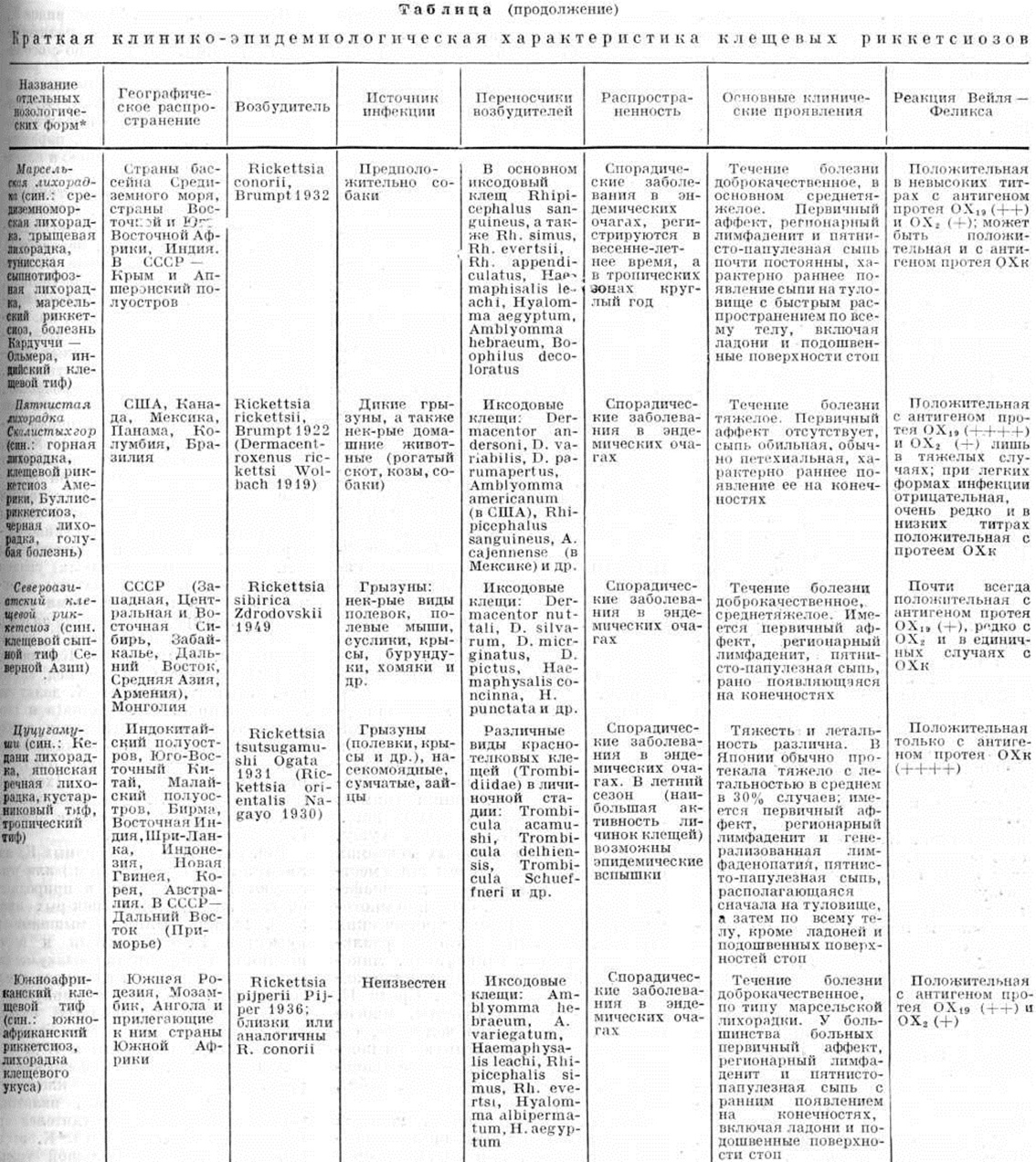 Диагноз основывается на типичной клинические, картине болезни и подтверждается серологический тестами — РСК и реакцией Вейля — Феликса, с помощью которой у всех больных выявляются антитела к штаммам протея ОХ19 и ОХ2. Для выделения риккетсий из крови используют морских свинок и белых мышей, особенно сосунков. Дифференциальный диагноз проводят с встречающимся в данном эпидемический очаге блошиным эндемическим тифом, при котором не бывает первичного аффекта и регионарного лимфаденита, и с цуцугамуши, которая протекает тяжело и с осложнениями. Лечение проводится, как и при других риккетсиозах. Прогноз всегда благоприятный. Летальные исходы не описаны. Профилактика не разработана. Клещевой пароксизмальный риккетсиоз (синонимы ixodorickettsiosis раroxysmalis) — острая инфекционные болезнь риккетсиозной этиологии, протекающая доброкачественно, без сыпи, с частыми короткими рецидивами после первичного лихорадочного приступа и при отрицательной реакции Вейля — Феликса. Описан на Украине в 1945 —1948 годы Н. Н. Сиротининым с соавторами; ими установлена риккетсиозная этиология болезни и выяснены некоторые вопросы эпидемиологии, а Б. Я. Падалкой и О. П. Матвеевым — особенности клиники. Этиология. Н. Н. Сиротинин с соавторами воспроизвели экспериментальную инфекцию у иксодовых клещей Ixodes ricinus и у платяных вшей при заражении их по Вейглю. По морфологический и тинкториальным свойствам возбудитель во многом был подобен возбудителю окопной лихорадки — R. quintana. Однако остались неизученными цитопатогенные свойства и иммунологический дифференциация его. Условно возбудитель был назван R. rutchkovskyi nov. spec. Эпидемиология. Клещевой пароксизмальный риккетсиоз считается природно-очаговой болезнью. Источником возбудителя инфекции предположительно являются рыжие полёвки, а переносчиками иксодовые клещи I. ricinus, которые рассматриваются и как резервуар возбудителя. Н. Н. Сиротинин с соавторами считают, что человек также может быть источником инфекции, а возбудители могут передаваться вшами. Случаи заболевания зарегистрированы лишь в сельской местности со строгой локальностью очагов вблизи лесов при отсутствии контактных и внутрибольничных заражений. Не исключается возможность генетической связи возбудителей клещевого пароксизмального риккетсиоза с возбудителями окопной лихорадки. Патогенез и патологическая анатомия не изучены. Клиническая картина. Инкубационный период не уточнён. Болезнь развивается остро и протекает с резкой головной болью, мышечными болями и болями в глазных яблоках, при температуре до 39—40 ° в течение 3—9 дней. Через 2—3 дня апирексии могут быть и одно-, трёхдневные рецидивы. Первичный эффект, регионарный лимфаденит и сыпь отсутствуют, печень и селезёнка не увеличиваются. В крови изменения незначительны, реакция Вейля — Феликса отрицательная со всеми штаммами протея. Течение доброкачественное. Серологические диагностика и лечение болезни не разработаны. Прогноз всегда благоприятный. Профилактика состоит в защите людей от нападения иксодовых клещей и уничтожении вшей. Краткая клинико-эпидемиологическая характеристика всех Клещевые риккетсиозы представлена в таблице.