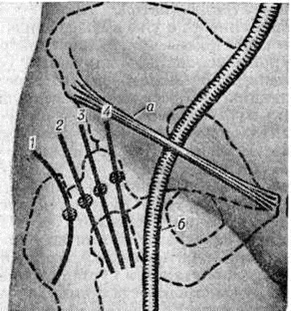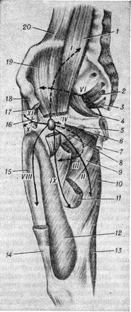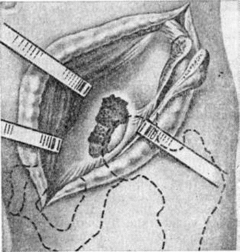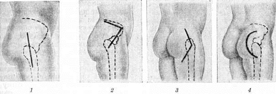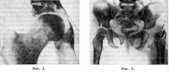 В ранней стадии развития острого гнойного Коксит (в среднем до 2 недель), когда изменена только синовиальная оболочка суставной капсулы, рентгенологическое картина сустава остаётся нормальной. К первым рентгенологическое проявлениям заболевания относятся остеопороз, появление краевых узур головки у места прикрепления капсулы, сужение суставной щели вследствие разрушения хряща, частичный остеолиз замыкающей суставной пластинки. При дальнейшем распространении деструктивного процесса развивается неподвижность в суставе, вызванная сильной болью. Сустав припухает, краснеет, образуются гнойные затеки. Болезнь быстро прогрессирует. Самопроизвольное вскрытие гнойников или артротомия значительно уменьшают интоксикацию и боль, но остаётся свищ с большим или меньшим гнойным отделяемым; разрушения сустава прогрессируют, приводя к порочной установке конечности и грубым анатомо-функциональный нарушениям. На рентгенограмме суставные поверхности приобретают нечёткие и неровные контуры, головка бедренной кости уменьшается, суставная впадина расширяется, нарастает остеопороз. В фазе затихания наблюдается постепенный исход в деформирующий коксартроз либо в фиброзный или костный анкилоз (смотри полный свод знаний). Наиболее опасны Коксит, развивающиеся вследствие пупочного сепсиса или эпифизарного остеомиелита,— так называемый инфантильные артриты. В этих случаях разрушения проксимального конца бедренной кости особенно велики и анатомо-функциональный нарушения весьма выражены, Для лечения гнойного Коксит важное значение имеет определение чувствительности микрофлоры к антибиотикам. Лечение включает обязательную строгую иммобилизацию сустава. Операции показаны при выраженных деструктивных процессах и наличии гнойных затёков. Задачей их является широкое вскрытие сустава и гнойных скоплений с созданием свободного оттока гноя. Поэтому в активной фазе гнойных Коксит наиболее частая операция — дренирующая артротомия со вскрытием всех затёков. На рисунок 12 изображены затеки, имеющие наибольшее клиническое значение (по В. Ф. Войно-Ясенецкому). Сквозное промывание сустава антибиотиками и антисептиками, дезинтоксикационные мероприятия, общеукрепляющая терапия, пассивная иммунизация с помощью антистафилококковой плазмы, антистафилококкового гамма-глобулина позволяют в ряде случаев добиться ликвидации процесса и в дальнейшем восстановить подвижность сустава. Однако более типичный исход — костный или фиброзный анкилоз тазобедренного сустава. В случае анкилозирования в порочном положении конечности в дальнейшем приходится прибегать к корригирующим операциям (смотри полный свод знаний Остеотомия). Особенно тяжело протекают гнойные Коксит огнестрельного происхождения в связи с наличием размозжённых и некротизированных тканей, костных осколков и инородных тел в ране и так далее Характерно развитие обширных флегмон. Огнестрельные Коксит чаще других осложняются сепсисом, септикопиемией, раневым истощением. Лечение этих Коксит принципиально то же, но необходимы более обширные резекции. Исходы этих Коксит менее благоприятные.