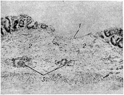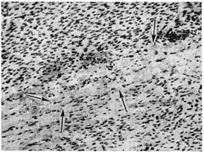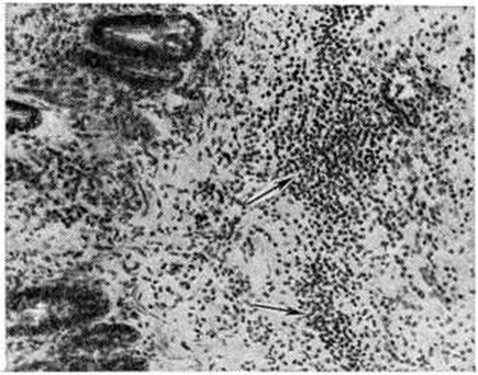 При Коли–инфекция в ряде случаев, кроме нейроваскулярных и дистрофических изменений, наблюдается также пролиферация клеток стромы слизистой оболочки и очаговая воспалительная инфильтрация подслизистой основы кишки лимфогистиоцитарными элементами с большей или меньшей примесью полинуклеаров (рисунок 1). Для обнаружения воспалительных очагов необходимо исследовать кишку на большом протяжении, так как процесс развивается в местах наибольшего скопления бактерий и токсинов.