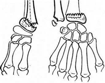 Очень часто перелом дистального конца лучевой кости сопровождается отрывом шиловидного отростка локтевой кости.