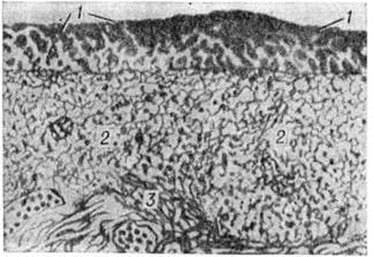 Субэпителиальный слой Конъюнктива образован в общем из тех же двух основных элементов, что и истинная лимфоидная ткань,— из сетевидной стромы (ретикулум), плазматических клеток и лимфоцитов, иногда образующих небольшие скопления — фолликулы. Глубокий слой представлен рыхлой волокнистой соединительной тканью, относительно бедной сосудами и клеточными элементами. В нормальной Конъюнктива взрослого отмечается обилие малодифференцированных клеток и разнообразных по виду гистиоцитарных элементов. В субэпителиальном слое имеется сеть аргирофильных волокон, в петлях которых скапливаются клетки. Эластические тонкие волоконца представлены в небольшом количестве (рисунок 1). В первые 2—3 месяцев внеутробного развития человека соединительнотканная основа Конъюнктива век (её собственная пластинка) состоит из рыхлой соединительной ткани и тонких коллагеновых волокон (рисунок 2). В ней, в отличие от Конъюнктива взрослых, обнаруживается значительно меньшее количество клеточных элементов и большая нежность и рыхлость расположения волокон соединительнотканной основы.