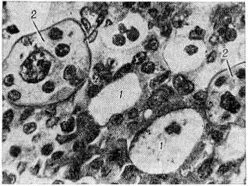 Рис Микропрепарат злокачественной кортикостеромы, образованной преимущественно светлыми клетками (1) и гигантскими многоядерными клетками (2); × 250.