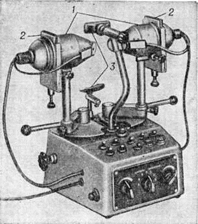 Для компенсации угла косоглазия, определения и развития фузионных резервов, подбора средств коррекции применяют наборы призм с разной преломляющей силой, призменные линейки и бипризмы. Наиболее отвечают медицинский требованиям по своим функциональный свойствам и эксплуатационным качествам бипризмы. Большинство бипризм имеет размеры, позволяющие применять их в пробных оправах одновременно с корригирующими линзами. В Советском Союзе выпускается бипризма офтальмокомпенсатор ОКП-1, преломляющая сила которой меняется до 30 диоптрий. Стереооптические приборы применяются для исследования бинокулярного глубинного зрения и стереоскопического зрения. Для исследования и восстановления бинокулярного глубинного зрения предложен Ряд приборов, прототипом которых является прибор Геринга. В СССР выпускаются два прибора для восстановления нормального бинокулярного глубинного зрения — стереокорректор КБЗ-1 и стереолокализатор ЛБЗ-1. Приборы для исследования и лечения двигательного аппарата глаз применяются для определения функциональный состояния глазодвигательной мышцы или групп мышц методом коордиметрии, для исследования и развития подвижности и конвергентных движений глаз, для контроля эффекта операции на глазодвигательных мышцах. Метод коордиметрии в СССР проводится с помощью прибора офтальмокоордиметра ОКМ-1 (рисунок 7). Для исследования и развития подвижности глаз предназначен прибор «Мускултренер» (СССР). Для исследования и развития конвергенции в СССР выпускается прибор под названием «Конвергенцтренер».
