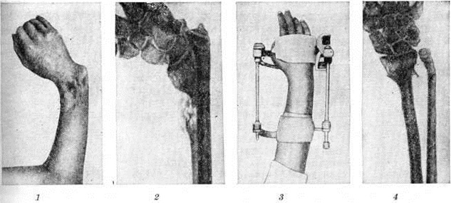 Лечение приобретённой лучевой Косорукость должно быть направлено не только на устранение деформации, но и на нормализацию функции кисти, для чего необходимо восстановить целость и обычную длину лучевой кости. С этой целью применяют двухэтапное лечение: вначале в течение 3—5 недель производят дистракцию по 1—2 миллиметров в сутки до вправления подвывиха локтевой кости на дистракционно-компрессионном аппарате (смотри полный свод знаний), спицы которого проведены через основание I — IV пястных костей или дистальный отломок лучевой кости и через обе кости предплечья в проксимальном отделе (рисунок 2). Затем, не снимая аппарата, производят костную пластику дефекта лучевой кости. Фиксация в аппарате продолжается до полной консолидации отломков и трансплантата.