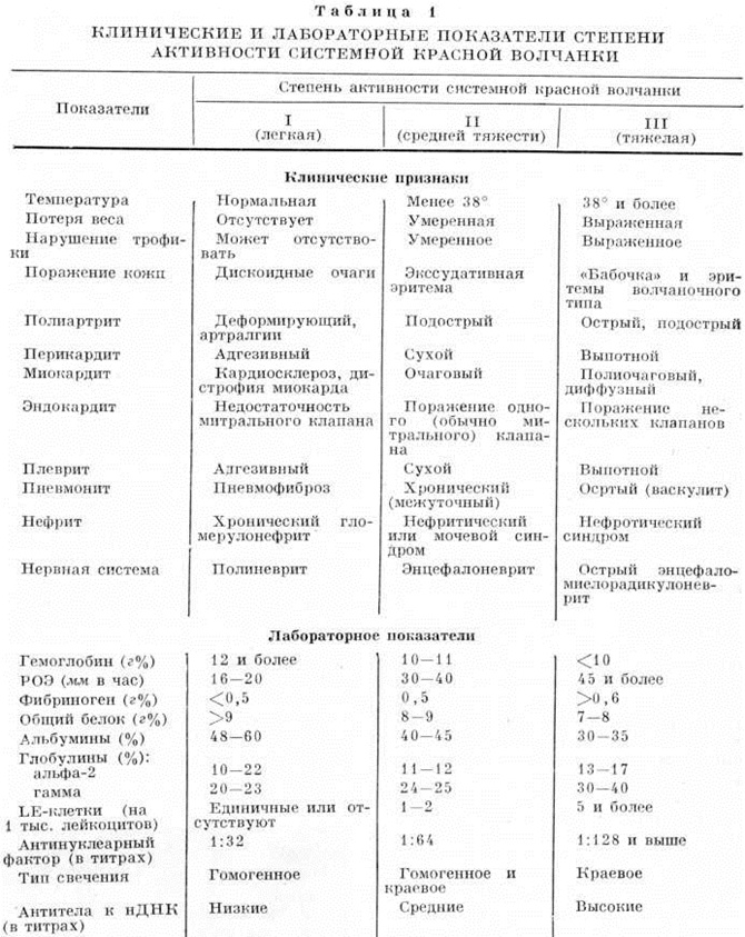 Антитела к ДНК определяются различными методами в РПГА (смотри полный свод знаний Гемагглютинация), в которой бараньи эритроциты нагружены ДНК, в реакции флоккуляции частиц бентонита (смотри полный свод знаний Флоккуляция), также нагруженных ДНК; кроме того, используют метод радиоиммунного связывания меченной по йоду нДНК и иммунофлюоресценции, где в качестве субстрата нДНК берут культуру Crithidia luciliae. При хронический полиартрите и тяжёлом поражении печени могут обнаруживаться положительные реакции на ревматоидный фактор в реакции Волера — Роуза (смотри полный свод знаний Ревматоидный артрит) или латекс-агглютинации (смотри полный свод знаний Агглютинация). Полезно также исследование комплемента СН50 и его компонентов, снижение которых обычно коррелирует с активностью волчаночного нефрита. Почти у всех больных значительно ускорена РОЭ — до 60—70 миллиметров в часов. Более чем у половины больных наблюдается лейкопения (ниже 4000 в 1 микролитров) со сдвигом в формуле крови до промиелоцитов, миелоцитов и юных в сочетании с лимфопенией (5—10% лимфоцитов). Весьма часто наблюдается умеренная гипохромная анемия. В редких случаях развивается гемолитическая анемия с чертами приобретённого гемолиза (смотри полный свод знаний) и положительной реакцией Кумбса (смотри полный свод знаний Кумбса реакция). Тромбоцитопения (ниже 100 000 в 1 микролитров) наблюдается часто, в редких случаях — синдром Верльгофа. Таким образом, при установлении диагноза системной Красная волчанка следует учитывать всю клинические, картину, данные лабораторный методов исследования и биопсийного материала почек, синовии и кожи. Для более полной оценки состояния больного целесообразно определять степень активности патологический процесса. Клинические, и лабораторный характеристика степеней активности системной Красная волчанка дана в таблице 1. Лечение, начатое в начале болезни, даёт наилучший эффект. В острый период лечение проводят в стационаре, где больным следует обеспечить полноценное питание с достаточным количеством витаминов группы В и С. Для индивидуализации лечения решающее значение имеет дифференцированное определение степеней активности патологический процесса (таблица 1). При патологический процессе III степени активности всем больным, независимо от варианта течения, показано лечение глюкокортикостероидами в больших дозах (в день 40—60 миллиграмм преднизолона или другого препарата в эквивалентных дозах), при II степени — соответственно меньшие дозы (30—40 миллиграмм в день), а при I степени — 15—20 миллиграмм в день. Чрезвычайно важно, чтобы начальная доза глюкокортикостероидов была достаточной для надёжного подавления активности патологический процесса. Особенно большие дозы (50—60—80 миллиграмм в день преднизолона) следует назначать при нефротическом синдроме, менингоэнцефалите и других диффузных процессах в нервной системе — так называемый волчаночном кризе. Лечение глюкокортикостероидами в максимальной дозе проводят до наступления выраженного эффекта (по данным снижения клинико-лабораторных показателей активности), а при нефротическом синдроме — не менее 2—3 месяцев, затем дозу гормона медленно снижают, ориентируясь на предлагаемую схему (таблица 2), но соблюдая принцип индивидуализации с целью предотвращения синдрома отмены или 
