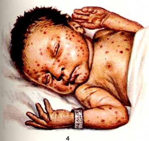 При заболевании Краснуха беременных женщин в первые три месяца беременности (в период органогенеза) у плода часто (в среднем в 50% случаев) возникают пороки развития различных органов и систем (смотри полный свод знаний Эмбриопатии), в том числе синдром Грегга (катаракта, глухота, пороки сердца), может быть микроцефалия (смотри полный свод знаний), нарушение развития скелета и черепа. При заражении Краснуха беременных женщин в более поздние сроки у плода как результат вирусного поражения развиваются фетопатии (смотри полный свод знаний) — гемолитическая анемия, тромбоцитопеническая пурпура, гепатит (цветной таблица, ст. 288, рисунок 4), поражение костей, лёгких и прочее