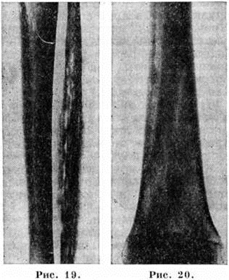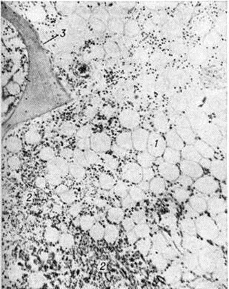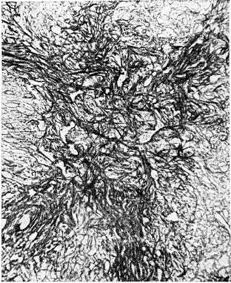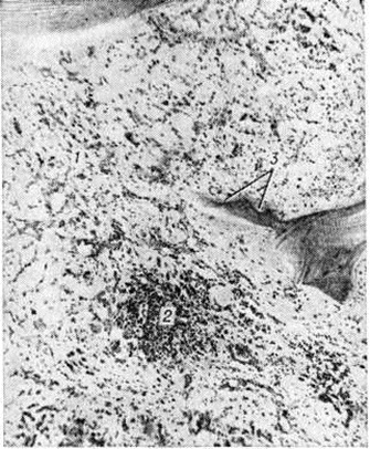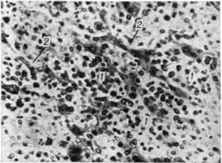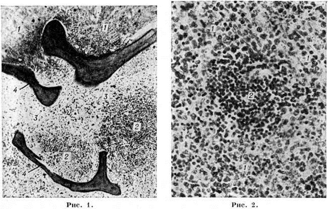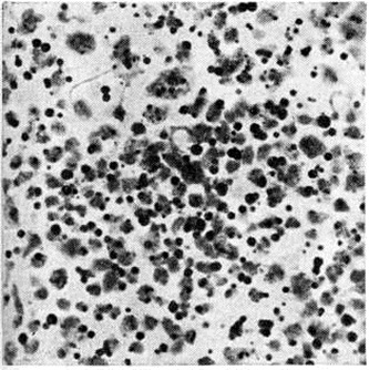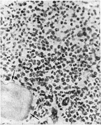 При всех формах Лейкозы наиболее интенсивное подавление лейкозной инфильтрации наблюдается в костном мозге. При вскрытии костный мозг плоских костей очагово или на всем протяжении суховатый, серого или серо-жёлтого цвета, в нем имеются участки жировой ткани и тёмно-красные поля кровоизлияний. При микроскопическом исследовании количество клеток в костном мозге снижено, видны поля опустошения различной величины, состоящие из отёчной стромы с наличием макрофагов и единичных бластных клеток (рисунок 8), зоны геморрагического пропитывания. Лейкозные инфильтраты располагаются очагово, содержат много клеток в состоянии лизиса, пикноза, распада (рисунок 9). Могут встречаться очаги некроза, представленные распадающимися лейкозными клетками, а также участки тотального коагуляционного некроза ткани с одновременной гибелью стромы. Иногда видны гигантские клетки с уродливыми гиперхромными ядрами, появление которых связывают с дистрофическими изменениями бластных элементов. Такие же клетки иногда выявляются в других органах. Динамическое исследование материала трепанобиопсий у больных острыми Лейкозы показывает, что уменьшение лейкозной инфильтрации с развитием гипопластических изменений закономерно наблюдается в костном мозге в фазе становления ремиссии. В стадии полной ремиссии имеет место выраженное в различной мере восстановление деятельной кроветворной ткани, однако все же нередко обнаруживаются бластные клетки в виде мелких скоплений или одиночно расположенных элементов. При острых, а также хронический Лейкозы протекающих с повторными ремиссиями, часто имеется заметное увеличение жировых клеток (рисунок 10); в связи с длительным применением кортикостероидов нарастают процессы резорбции костного вещества, отражением чего является резкое истончение, а местами полное разрушение костных балок (рисунок 10). Эти изменения наиболее выражены при острых Лейкозы у детей и могут сопровождаться образованием известковых метастазов. Описаны отдельные наблюдения распространённого нефрокальциноза (смотри полный свод знаний). Заметное снижение размеров лейкозных инфильтратов часто отмечается в селезёнке, лимфатических, узлах, печени (рисунок 11). В этих органах, как и в костном мозге, обнаруживаются различных размеров поля опустошения, геморрагического пропитывания ткани, группы лейкозных клеток с их распадом; при длительном течении возможно очаговое разрастание аргирофильных и коллагеновых волокон, частичное восстановление лимфатических, ткани в лимфоидных органах. При хронический длительно леченном миелолейкозе имеется резкий фиброз пульпы селезёнки с перестройкой её структуры (рисунок 12), участки липоматоза в лимфатических, узлах. Под влиянием лечения в связи с уменьшением объёма разрастаний все чаще при острых Лейкозы (даже при условии значительной продолжительности жизни больного) лимфатических, узлы, селезенка и печень сохраняют нормальные размеры и вес или бывают увеличены незначительно. При хронический Лейкоз, хотя размеры органов увеличены, однако не столь сильно, как до использования цитостатических средств. Значительное подавление лейкозного процесса иногда сопровождается развитием распространённых апластических изменений в костном мозге. Такой исход отмечается преимущественно при массивно