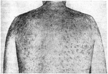 Специфические поражения кожи проявляются в виде узелковых и узловатых образований (рисунок 15 и 16), язвенно-некротических изменений вследствие разрушения лейкозного пролиферата, диффузного поражения в виде частичной или полной эритродермии. Для острого лейкоза характерны специфические островоспалительные процессы в коже, буллезные, симулирующие импетиго высыпания (рисунок 17), болезнь Дюринга, фурункулёз. Реже высыпания розеолезно-папулезного характера, в виде эритродермии, а также узлов бледно-розового или синюшно-багрового цвета плотноватой консистенции, слегка болезненных с шелушением на поверхности. Специфическим поражениям кожи при хронический Лейкозы свойственны черты хронический воспалительного дерматоза: поражённые участки кожи окрашены в застойные (синюшно-розовые, бурые) тона, значительно инфильтрированы (типа плоских инфильтратов), нередко лихенизированы, шелушатся. Для хронического лимфолейкоза характерно поражение кожи по типу эритродермии. Кожа при этом красного цвета с буроватым или синюшным оттенком, лихенизирована, сухая, напоминает кожу слона, с мелко или крупнопластинчатым шелушением. На фоне эритродермии могут возникать узлы и бляшки, отличающиеся более насыщенной окраской и плотностью. На участках больших инфильтратов волосяные фолликулы, сальные и потовые железы обычно отсутствуют. Опоясывающий герпес поражает чаще больных хронический лимфолейкозом и принимает необычную форму — гангренозную или генерализованную, отличающуюся продолжительным и тяжёлым течением. Обнаруживаемые при различных Лейкозы гистологический изменения кожи нередко весьма сходны, главное отличие заключается в клеточном составе пролиферата. Для острого Лейкозы характерны инфильтраты в коже и особенно в подкожной клетчатке, в клеточный состав которых входят в основном незрелые и в меньшей степени зрелые клетки миелоидного ряда. При хронический миелолейкозе, кроме густых скоплений клеток миелоидного ряда в коже и подкожной клетчатке, наблюдаются мелкие группы клеток, распространяющиеся в виде муфт периваскулярно и вокруг потовых желёз. Кроме клеток миелоидного ряда, в состав инфильтратов входят эозинофилы и недифференцированные клеточные элементы. Под сосочками кожи выявляется узкая зона, свободная от инфильтрата. При лимфолейкозе инфильтраты в коже состоят из круглых, лимфоцитарных клеток, не отличимых практически от нормальных лимфоцитов, и небольшого числа лимфобластов. На границе инфильтрата наблюдаются немногочисленные ретикулярные и плазматические клетки. Кожные проявления Лейкозы нужно отличать от изменений кожи, связанных с лечением больных Лейкозы цитостатическими и гормональными препаратами, облучением и другими методами, от геморрагического васкулита (смотри полный свод знаний Шенлейна — Геноха болезнь), импетиго (смотри полный свод знаний), болезни Дюринга (смотри полный свод знаний Дюринга болезнь), а также от доброкачественных кожных лимфоидных гиперплазий, имеющих форму узелков. Последняя группа включает саркоид Шпиглера — Фендта (смотри полный свод знаний Саркоидоз) и лимфоцитому кожи (смотри полный свод знаний). Дифференциальный диагноз основывается на гематологические данных, на характере клинические, и гистологический картины поражения. Для лечения поражений кожи при Л