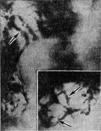Лейкозные изменения в лёгочной ткани и во внутригрудных лимфатических, узлах приходится дифференцировать с туберкулёзным их поражением. Поражение желудочно-кишечного тракта наблюдается при острых и хронический Лейкозы лимфоидного типа. При острых и хронический Лейкозы миелоидного типа лейкозные изменения в желудочно-кишечного тракте встречаются редко. При этих формах заболевания чаще развиваются вторичные некротически-язвенные поражения, обусловленные ареактивностью организма и проводимой цитостатической терапией. Лейкемическое поражение желудочно-кишечные тракта характеризуется ранним одновременным вовлечением в процесс различных отделов, например, желудка, луковицы двенадцатиперстной кишки и слепой кишки с конечным отделом подвздошной. Рентгенологически изменения в желудке и двенадцатиперстной кишке могут быть в виде полипообразных выбуханий слизистой оболочки (рисунок 23) или ограниченных плоских дисковидных утолщений стенок желудка, крупных опухолевых образований и резко утолщённых приподнятых складок слизистой оболочки; перистальтика сохранена или ослаблена. Локальная или диффузная инфильтрация стенки кишки может привести к перфорации, стенозу и непроходимости. Лейкозная инфильтрация желудка и кишечника наблюдается и при алейкемической фазе болезни, что создаёт трудности в распознавании природы этих изменений. Одновременное поражение луковицы двенадцатиперстной кишки, желудка, а часто и кишечника свидетельствует о лейкозной инфильтрации. Рентгенологические данные при необходимости подтверждаются эндоскопией и биопсией из поражённого отдела желудочно-кишечные тракта.