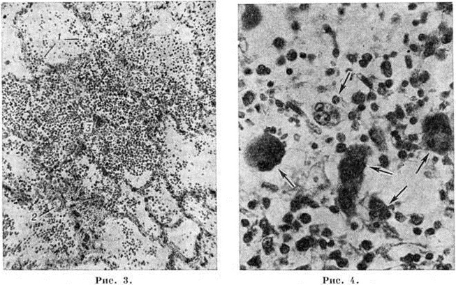 Высокий удельный вес среди причин смерти имеют пневмонии. Причинами смерти являются также общее малокровие и нарушение функции печени, сердца, лёгких и других органов, связанное с массивным специфическим поражением или сдавлением их и магистральных сосудов увеличенными лимфатических, узлами. Иногда смерть наступает от сопутствующих заболеваний — обострения туберкулёза, инфаркта миокарда, рака и другие. Хронический моноцитарный лейкоз характеризуется разрастанием клеток типа моноцитов, дающих положительную реакцию на неспецифическую эстеразу. На вскрытии обычно наблюдаются изменения, свойственные распространённому лейкозному процессу. Имеет место диффузное поражение костного мозга, довольно часто — значительное увеличение селезёнки, печени, возможно вовлечение в процесс всех групп лимфатических, узлов, желудочно-кишечного тракта. Нередко выявляются обширные опухолевые разрастания, локализующиеся главным образом в средостении и забрюшинном пространстве. Часты общее истощение, водянка полостей, анасарка. Геморрагии обычно выражены умеренно. Патологоанатомическую картину при макроглобулинемии Вальденстрема, миеломной болезни, эритремии, хронический сублейкемическом миелозе (остеомиелофиброзе) — сантиметров Вальденстрема болезнь, Миеломная болезнь, Остеомиелофиброз, Полицитемия. Особенности патоморфоза лейкозов в связи с лечением. При современных методах лечения патологоанатомическая картина Лейкозы как у детей, так и у взрослых часто отличается от типичной определёнными особенностями. Они выражаются уменьшением объёма лейкозной инфильтрации и возникновением гипо и аплазии в кроветворных органах, усилением дистрофических и некробиотических, а также фиброзных изменений, развитием разнообразных тяжёлых инфекционные осложнений. Морфологически проявления патоморфоза наиболее ярко представлены при острых Лейкозы особенно лимфобластном. Подавление лейкозного процесса может быть выражено в разной степени как уменьшением размеров разрастаний, так и исчезновением их в различных органах. В зависимости от этого при леченых Лейкозы может наблюдаться четыре основных варианта морфологический изменений: 1) очаговое уменьшение лейкозных разрастаний в кроветворных органах, главным образом в костном мозге; 2) значительное снижение лейкозной инфильтрации в кроветворных и других органах; 3) интенсивное подавление лейкозного процесса в костном мозге с сохранением обширных разрастаний за его пределами (внекостномозговая локализация); 4) выраженная распространённая лейкозная инфильтрация.